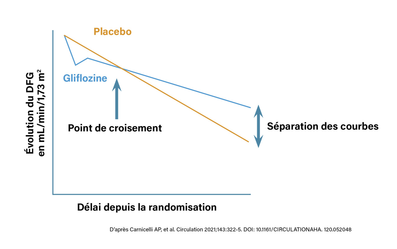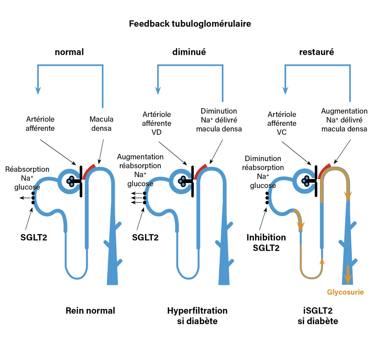 Il faut maintenant associer, en deuxième intention, un inhibiteur du cotransport sodium-glucose de type 2 (iSGLT2), même en l’absence de diabète, si le RAC résiduel sous IEC ou ARA2 reste ≥ 200 mg/g ou quel que soit le RAC si le DFGe est entre 20 et 45 mL/min/1,73 m2.5,6 L’indication des iSGLT2 est encore plus large chez les sujets diabétiques si le DFGe est supérieur à 60 mL/min/1,73 m2, puisque ces médicaments participent alors au contrôle de la glycémie. La réduction supplémentaire des événements rénaux majeurs chez des patients prenant déjà un IEC ou un ARA2 est de 30 à 44 % supplémentaires.5,6 Le mécanisme de la néphroprotection par les iSGLT2 est débattu. Il passe certainement en partie par un contrôle de l’hypervolémie et donc de l’albuminurie, comme tous les natriurétiques en association avec les bloqueurs du SRAA.7,8 L’effet natriurétique des iSGLT2 est comparable à celui exercé par un diurétique thiazidique pendant les premières semaines de traitement, avec une perte de poids similaire jusqu’à huit semaines, nécessairement liée à une perte d’eau et de sodium.9 Cette déplétion explique la perte aiguë de DFGe observée dès les deux premières semaines (fig. 1).5  Puis on observe une récupération très partielle aiguë du DFGe, probablement associée à un échappement partiel de l’effet diurétique, et ensuite la pente de la perte de DFGe sera plus lente que sous placebo.5 L’action natriurétique des iSGLT2 reste significative même quand le DFGe est < 45 mL/min/1,73 m2, alors que l’effet hypoglycémiant devient négligeable.8 Les iSGLT2 abaissent d’ailleurs la PAS d’environ 4 mmHg, et même 5 mmHg en mesure ambulatoire de la pression artérielle.9 Cependant, la réduction des événements rénaux majeurs est identique chez les diabétiques et les non-diabétiques, bien que la baisse d’albuminurie soit plus importante chez les diabétiques,10 démontrant qu’une partie du bénéfice rénal est indépendant de la baisse de l’albuminurie. La baisse supplémentaire de l’albuminurie chez les diabétiques s’explique par un effet hémodynamique supplémentaire des iSGLT2, spécifique à cette population, lié à la réactivation du feedback tubuloglomérulaire dans un contexte de multiplication des SGLT2 en réponse à la glycosurie (fig. 2).11 Les risques principaux associés au traitement par iSGLT2 sont les infections urogénitales et les acidocétoses chez les diabétiques.