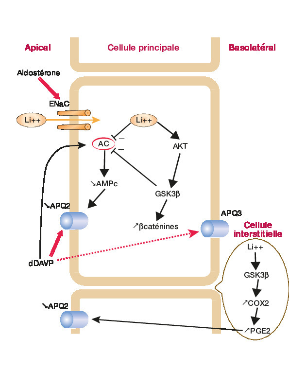Le lithium, cation monovalent, se comporte comme le Na+ ; il est filtré librement à travers le glomérule.1 Les réabsorptions de ces 2 ions sont proportionnelles. Soixante-quinze pour cent de la charge filtrée sont réabsorbés au niveau du tubule proximal. Une petite fraction l’est au niveau distal dans le canal collecteur, à travers le canal sodium épithélial (ENaC) [figure]. En cas de déplétion en sel, 20 % sont réabsorbés dans la branche ascendante large de l’anse de Henlé. La lithiémie augmente donc chez les patients traités quand le DFG diminue (hypovolémie, prise d’AINS, d’IEC ou d’ARA2) ou bien quand la réabsorption est stimulée par un régime désodé ou des diurétiques.