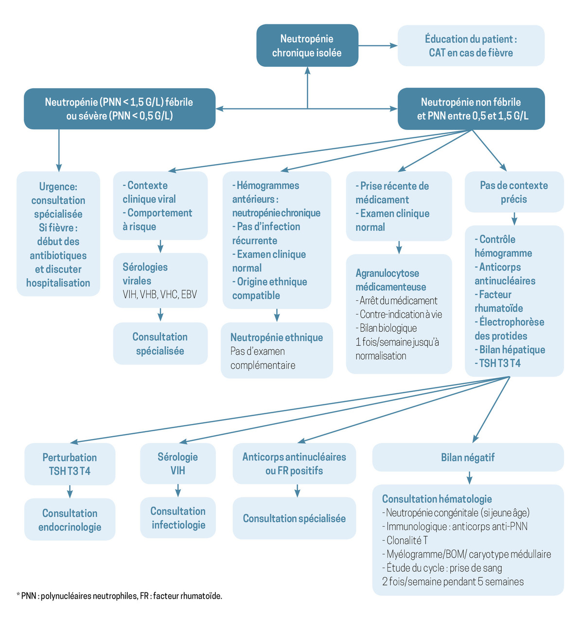 Lors de la découverte biologique d’une neutropénie, l’analyse du contexte clinique est primordiale. Cela conditionne le discours face au patient. Une neutropénie aiguë isolée sans infection associée doit faire, avant tout, rechercher une cause médicamenteuse. Si tel est le cas :