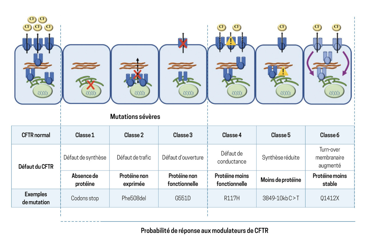 À l’heure actuelle, plus de 2 100 mutations du gène CFTR sont identifiées, avec des conséquences cliniques variables. Elles sont définies depuis plusieurs dizaines d’années selon leur appartenance à l’une ou l’autre des six classes existantes (fig. 1). L’élément le plus important à retenir et qui retentit sur la probabilité de réponse ou non au traitement par ETI, modulateur de CFTR, est la synthèse ou non de la protéine CFTR.