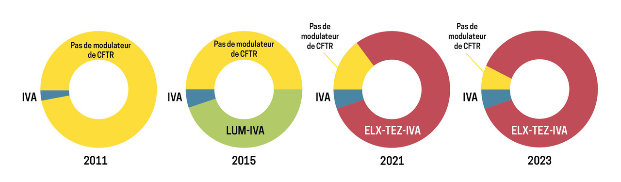 En 2011, le premier traitement modulateur de CFTR est apparu : l’ivacaftor (Kalydeco). Il n’était, à l’époque, indiqué que pour les patients porteurs d’une mutation G551D (classe 3) ; l’autorisation de mise sur le marché (AMM) en France a été obtenue en 2013.