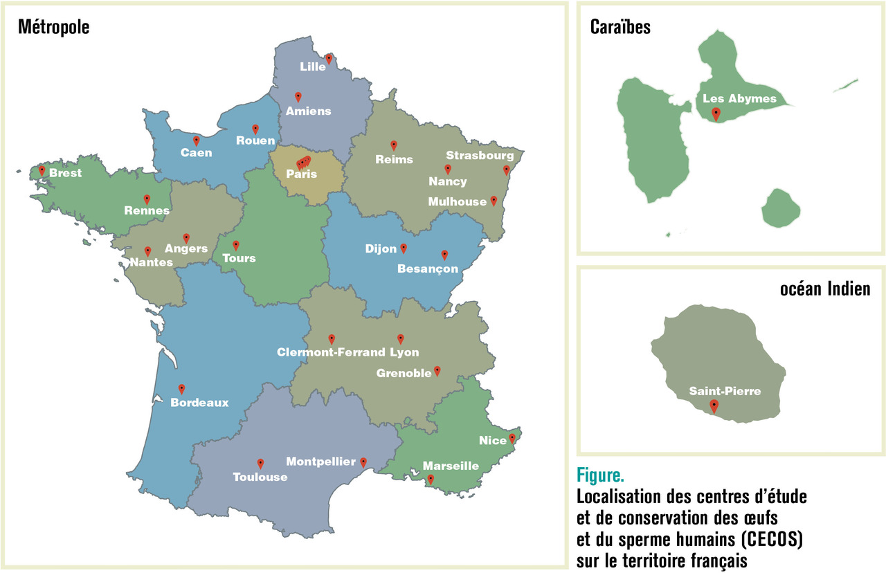 Les CECOS sont répartis sur le territoire français et sont des unités intégrées dans les centres hospitaliers universitaires (CHU) [v. figure]. Ils sont associés à un service de médecine de la reproduction ou à un centre d’assistance médicale à la procréation qui peut mettre en œuvre l’exploration de l’infécondité et la prise en charge des couples pour la procréation (inséminations, fécondation in vitro…). Il s’agit d’équipes pluridisciplinaires regroupant principalement des biologistes, des cliniciens, des sages-femmes, des psychologues et un personnel compétent pour les prises en charge développées dans ces centres.