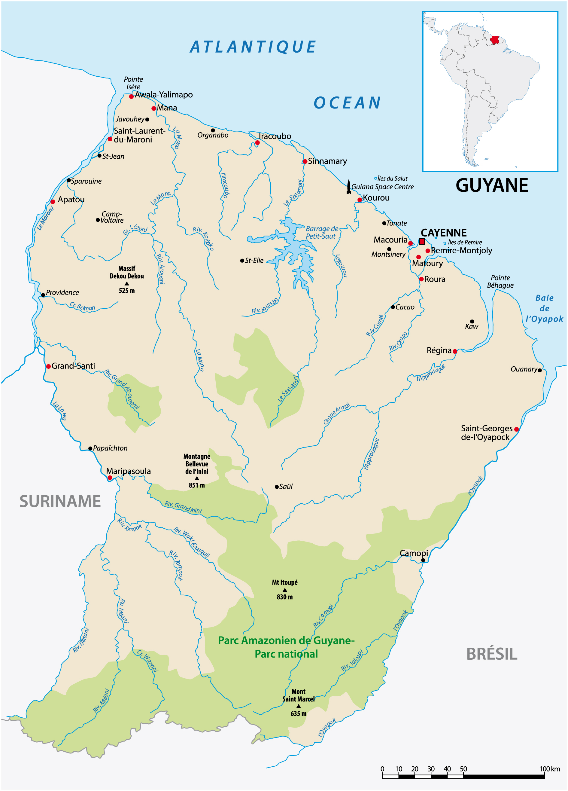 La Guyane est une région et un département français d’outre-mer situé en Amérique du Sud. Elle est la plus grande région de France et la moins peuplée,2 son territoire étant à 90 % recouvert par la forêt amazonienne.