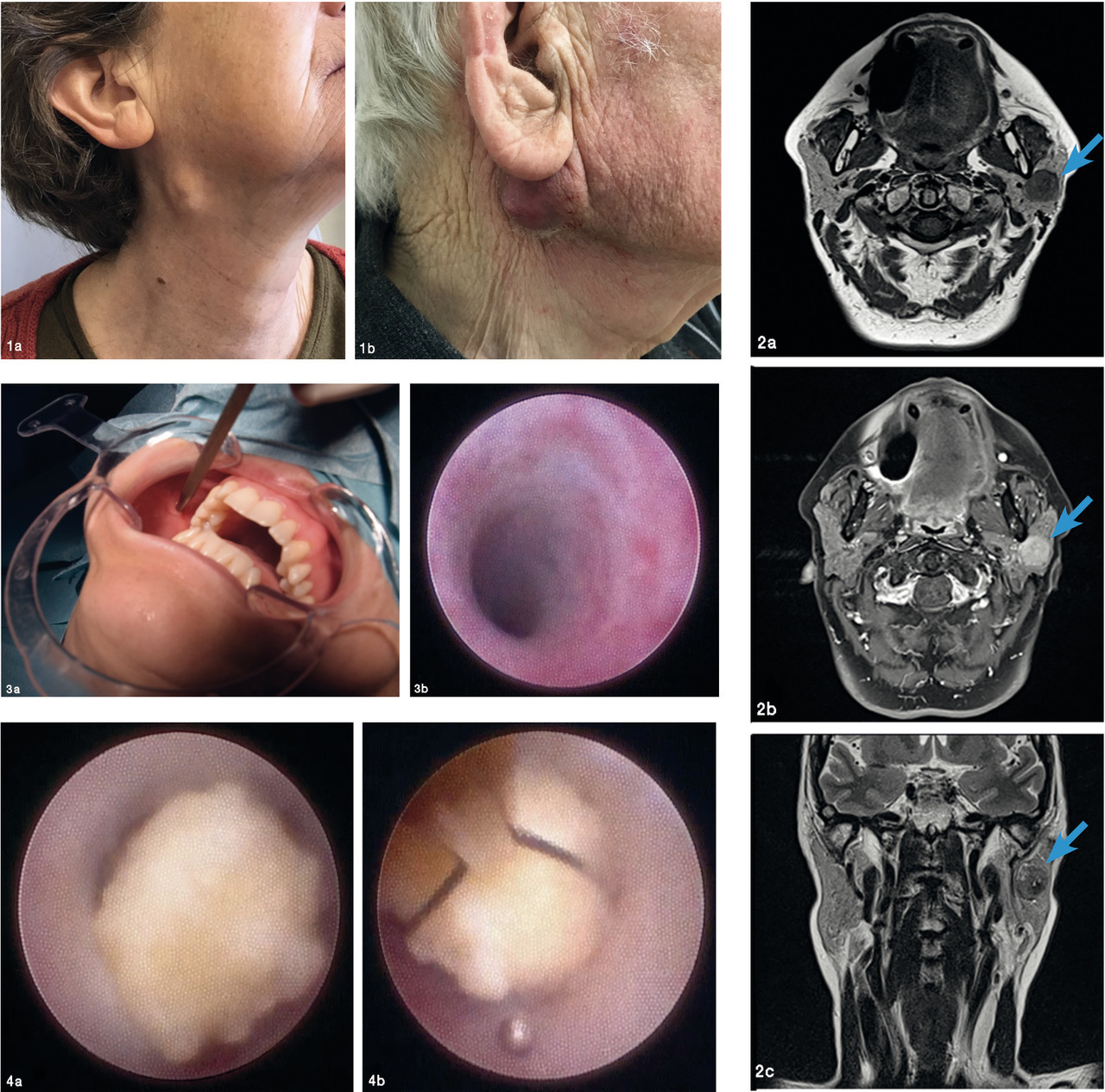 La tuméfaction est classiquement nodulaire, prétragienne, rétro-angulo-mandibulaire, voire jugale (