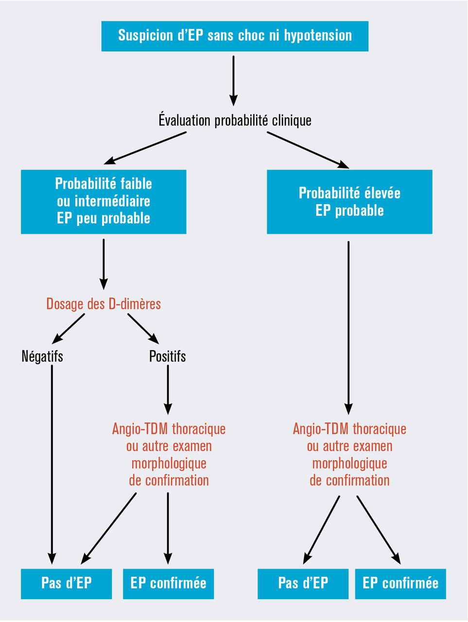 En cas de probabilité clinique faible ou intermédiaire d’embolie pulmonaire, la valeur prédictive négative élevée des D-dimères justifie qu’ils soient systématiquement dosés afin de réduire la nécessité de réaliser un examen d’imagerie. Un taux de D-dimères strictement inférieur à 500 µg/L ou inférieur à un seuil adapté à l’âge chez les patients de plus de 50 ans (âge x 10) permet d’exclure le diagnostic d’embolie pulmonaire dans un contexte de probabilité clinique non forte. En cas de D-dimères positifs, la réalisation d’un examen morphologique de confirmation (angiotomodensitométrie [angio-TDM] thoracique ou scintigraphie de ventilation/perfusion) est nécessaire pour porter le diag- nostic d’embolie pulmonaire (fig. 1).