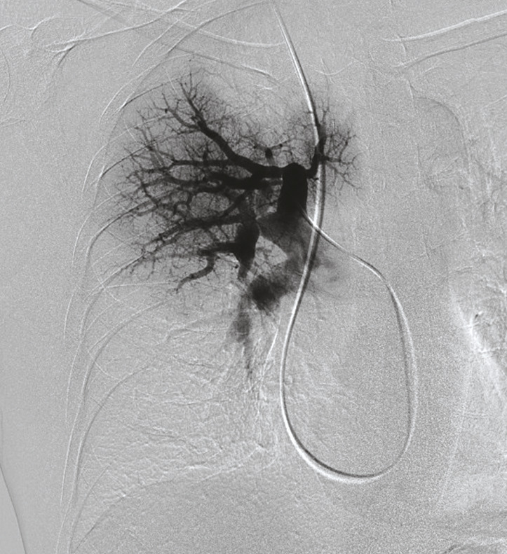 La prise en charge de l’hyper- tension pulmonaire thrombo- embolique chronique dépend de la localisation des séquelles thromboemboliques, proximale ou distale. Deux examens sont utiles à ce stade, l’angio-TDM thoracique (fig. 6) et l’angiographie pulmonaire (fig. 7).