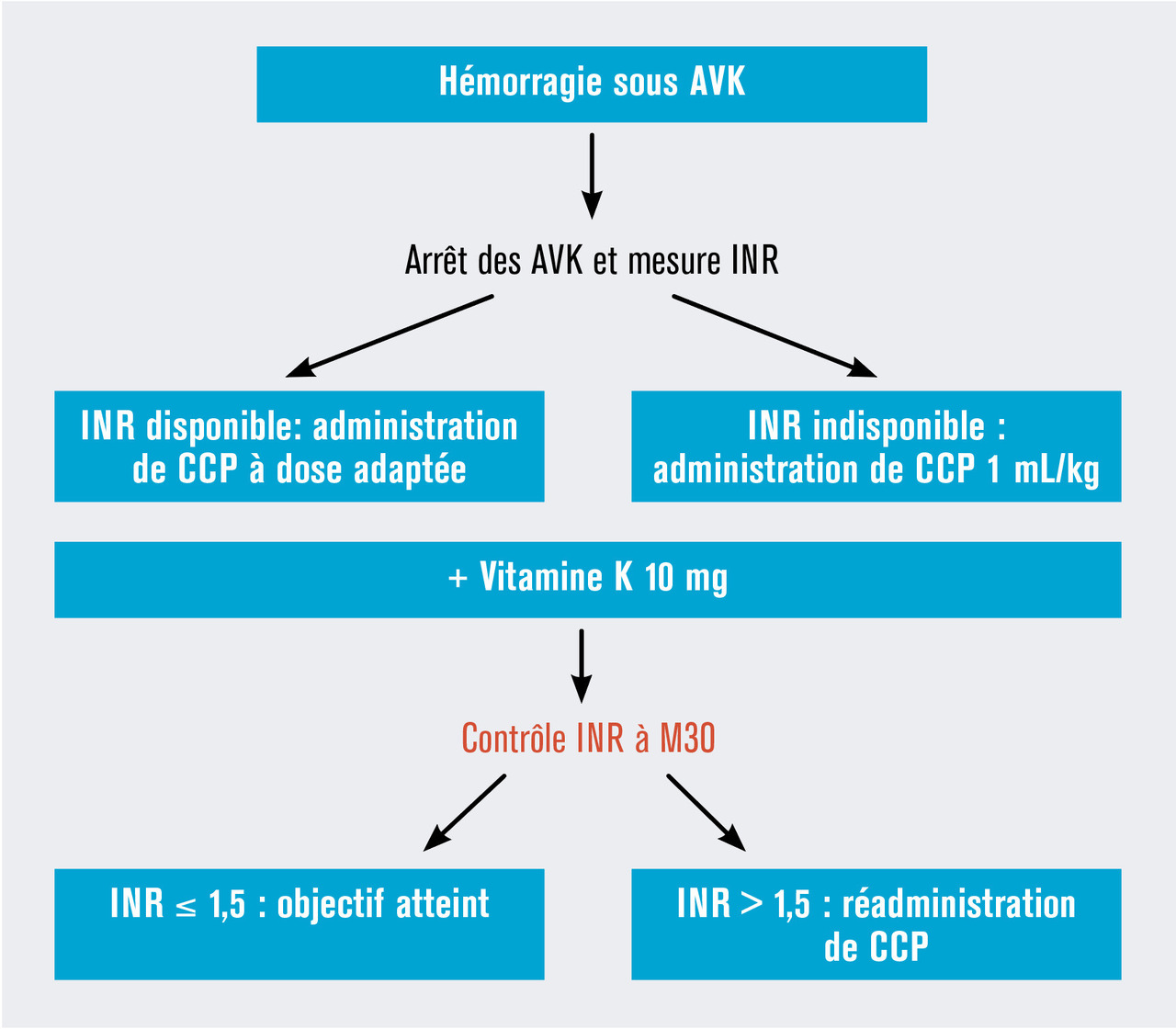 En cas d’hémorragie grave survenant sous AVK, l’objectif est d’obtenir un INR inférieur à 1,5 dans les plus brefs délais. Il est impératif de suspendre le traitement anticoagulant, de mesurer l’INR et d’administrer en urgence un concentré de complexes prothrombiniques (CCP) et 10 mg de vitamine K par voie orale ou intraveineuse lente quel que soit l’INR de départ (fig. 4).2