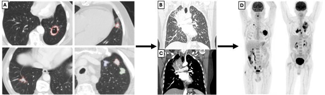 Lorsqu’ils sont détectés par imagerie, les nodules de moins de 6 mm ne sont pas suivis chez les patients à bas risque (non-fumeurs). Pour les nodules mesurant entre 6 et 8 mm, une TDM de contrôle est réalisée à six-douze mois. Enfin, une TEP-TDM au FDG (ou un scanner ou une biopsie) est indiquée pour les nodules pulmonaires solitaires solides de plus de 8 mm de diamètre (selon les guidelines de la Fleischner Society) avec de bonnes performances pour différencier les lésions bénignes et malignes.12 Un exemple de nodules pulmonaires solitaires solides visualisés sur la TDM thoracique et une TEP-TDM au FDG de suivi est présenté en figure 3. La détection peut cependant être limitée par des faux positifs et négatifs dus à des facteurs techniques ainsi qu’aux éventuelles infections ou inflammations intercurrentes.