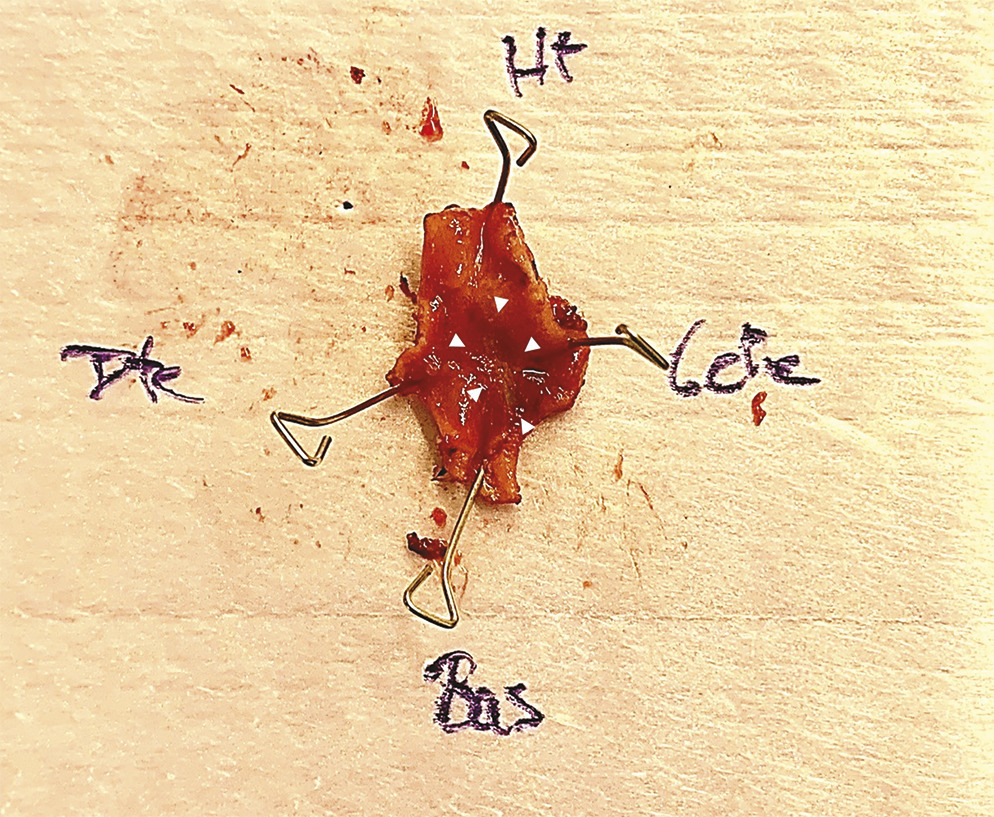 Afin d’améliorer les résultats de la méthode de préservation rectale, d’autres équipes, notamment celle de Bordeaux, ont proposé une approche comportant une exérèse locale de la cicatrice après radiochimiothérapie pour confirmer histologiquement la bonne réponse au traitement (fig. 2 ). Cette approche a été testée dans l’essai de phase III randomisé GRECAR II, qui a formellement validé le principe de préservation rectale dans la prise en charge des cancers du rectum localement évolués.14 Dans cette étude, les patients qui avaient un cancer du rectum localement évolué de moins de 4 cm, classé cT2T3 à l’issue du bilan préthérapeutique, recevaient une radiochimiothérapie standard. En cas de bonne réponse, définie par une réduction de taille de la tumeur conduisant à un résidu tumoral de moins de 2 cm, les malades étaient randomisés pour avoir soit une exérèse locale de la cicatrice, soit le traitement standard, c’est-à-dire une proctectomie avec exérèse totale du mésorectum. Une chirurgie de rattrapage était proposée dans le groupe exérèse locale en cas de réponse histologique insuffisante (tumeur résiduelle ypT2T3) ou d’exérèse incomplète R1. Le critère principal de l’étude était composite, comportant la morbidité postopératoire sévère, la récidive locale, la mortalité, et les événements indésirables sévères à distance.