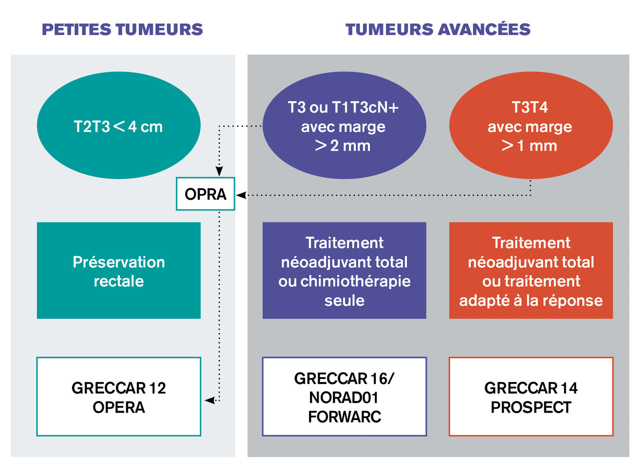 La préservation rectale pourrait aussi être proposée dans des formes plus avancées, mais élargir les critères, donc la population cible, risquerait d’augmenter le recours à la chirurgie de rattrapage, dont les résultats sont décevants.14 Plusieurs études sont actuellement en cours pour apporter des éléments de réponse à ces nouvelles questions (essai GRECCAR 12, OPERA et OPRA)17 [