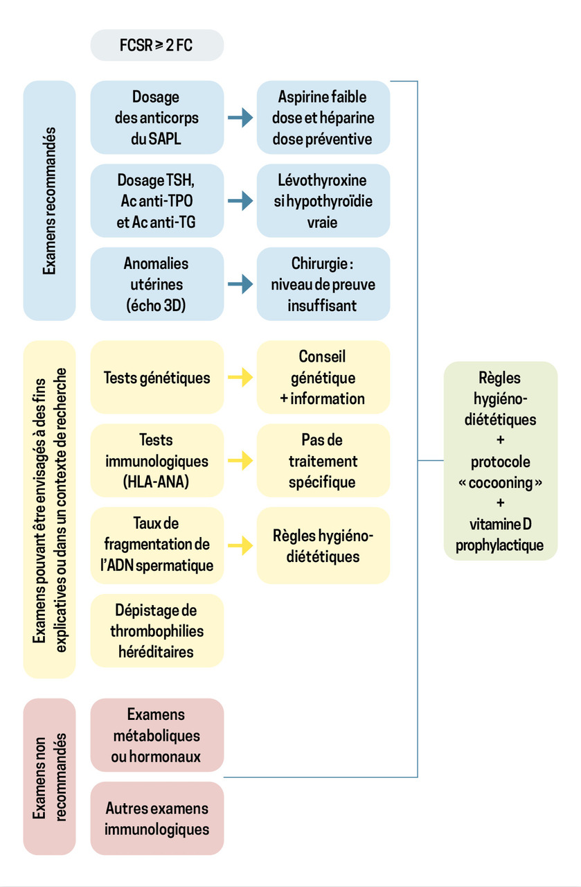 Comme pour les définitions, le bilan recommandé par les différentes sociétés savantes n’est pas consensuel, hormis le bilan de première intention, à réaliser systématiquement pour dépister des situations pour lesquelles le traitement a prouvé son intérêt dans la diminution du risque de fausse couche ultérieure :