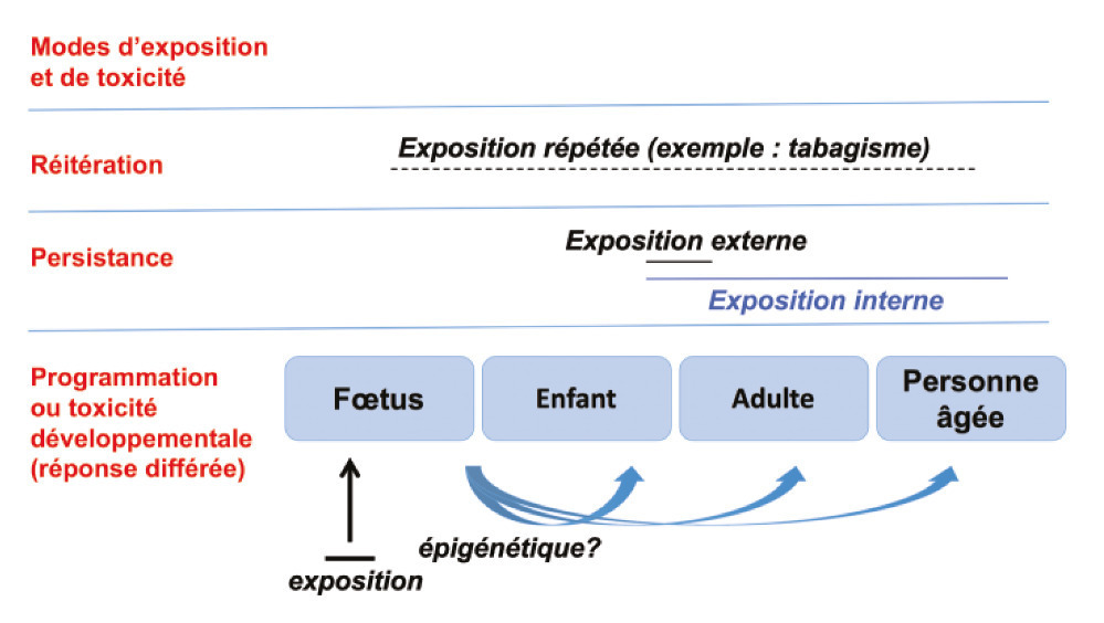 Alors que la toxicologie traditionnelle s’est principalement concentrée sur la substance (« la dose fait le poison »), il est devenu clair que l’état de l’organisme ciblé est également critique. En effet, dans certaines conditions, les organismes peuvent être plus vulnérables à la toxicité des produits chimiques.13 Cela pourrait être dû, par exemple, au contexte génétique de l’individu contaminé, ce qui a conduit au développement d’interactions gène-environnement dans les études épidémiologiques. Le statut sanitaire et social est une autre source de vulnérabilité, par exemple si la personne souffre de diabète, d’une maladie rénale ou d’un faible statut socioéconomique. Mais, comme indiqué précédemment, la plupart des progrès récents ont été réalisés sur la vulnérabilité liée au stade du développement car certaines périodes de développement ont une probabilité de toxicité plus élevée en cas d’exposition à un produit chimique. De toute évidence, le remodelage épigénétique et la différenciation des cellules souches au cours du développement sont des causes probables de vulnérabilité, en particulier lorsque la toxicité est liée à une modification de la programmation.13