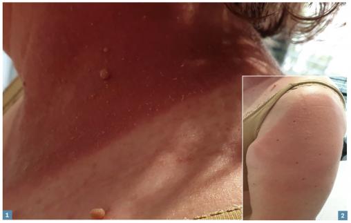 Sylvie, 60 ans, s’inquiète d’un érythème infiltré (avec bulles et légère desquamation) au niveau du cou et de l’épaule (fig. 1 et 2 ). Elle a appliqué du diclofénac la veille d’une randonnée au terme de laquelle cette dermatose prurigineuse est apparue, avec une sensation de brûlure.