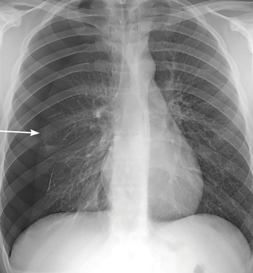 La radiographie thoracique (de face, debout et en inspiration ; clichés en expiration non recommandés) met en évidence une hyperclarté avasculaire plus ou moins importante délimitée en dedans par la plèvre viscérale visualisée par une ligne bordante pleurale. On parle de pneumothorax « complet » en cas de décollement sur toute la longueur de la ligne axillaire de l’apex au diaphragme.