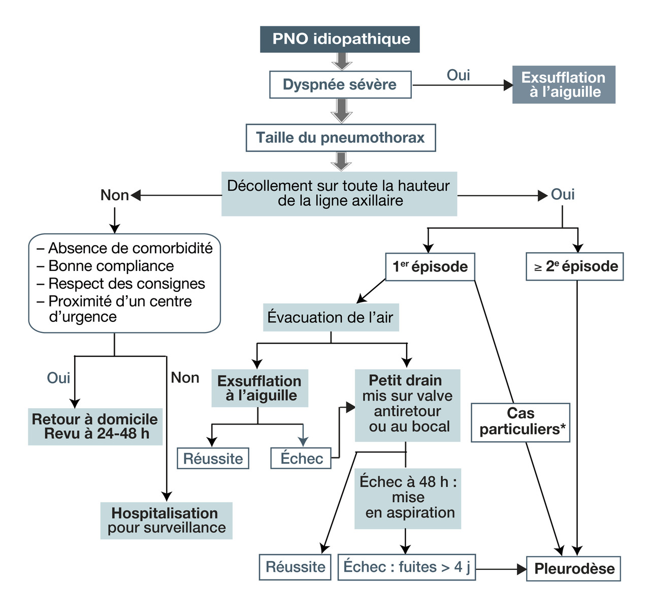 En cas de pneumothorax spontanés secondaires et traumatiques : le drainage est recommandé en 1re intention, si la taille du pneumothorax le permet, en hospitalisation (au moins 24 heures). Pour les iatrogènes (évolution généralement favorable) : l’abstention est possible (surveillance).