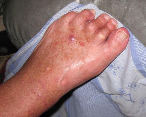 Karl, vacancier norvégien de 61 ans, consulte pour des bulles apparues sur un pied après une exposition solaire la veille (figure ). Les autres parties du corps sont indemnes. Il montre les résultats de ses analyses effectuées 3 mois plus tôt : taux de GGT à 287 UI/L, ALAT à 87 UI/L, ASAT à 68 UI/L, VGM à 114 µm3 et une hypertriglycéridémie à 4,8 g/L.