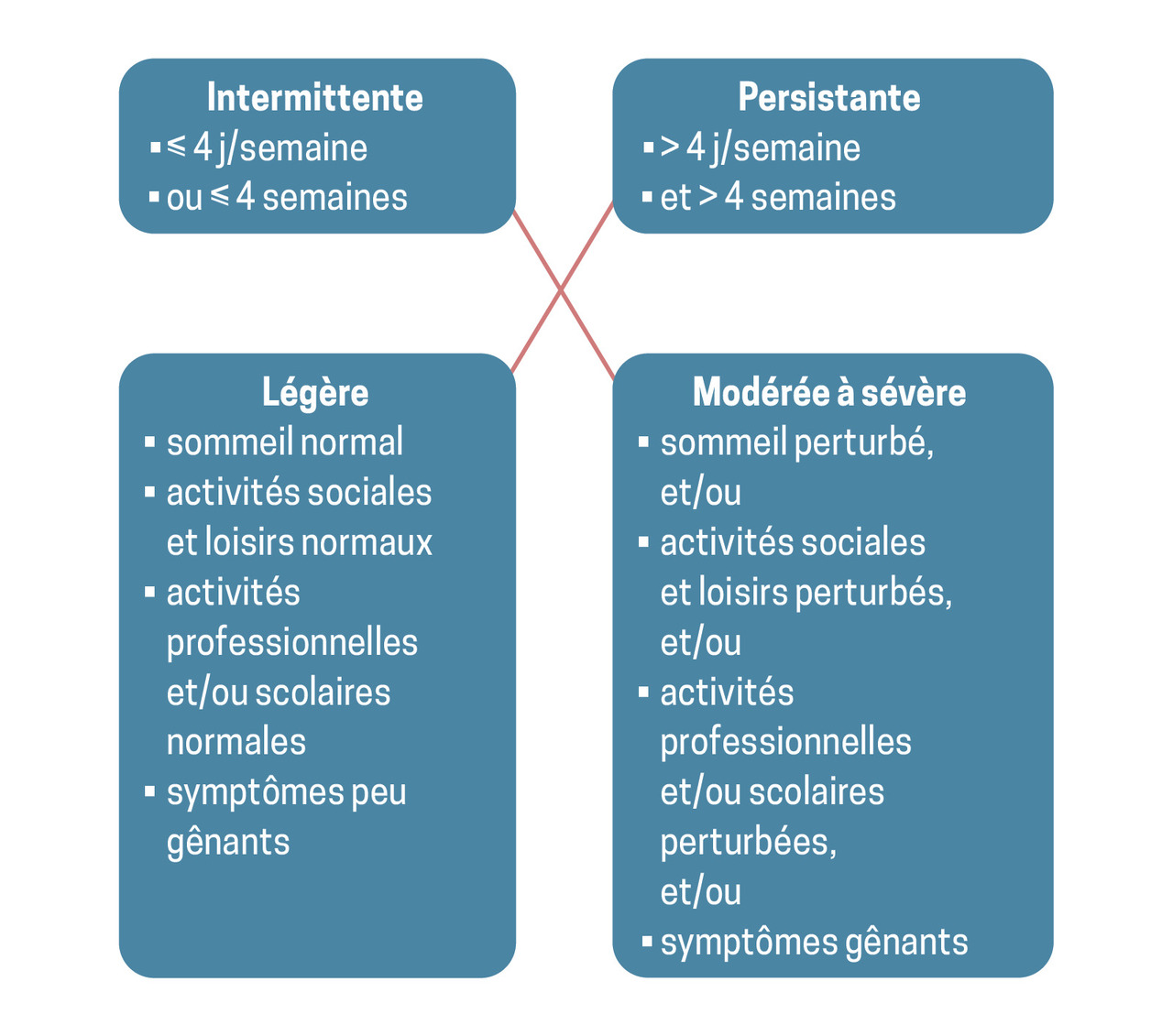 Les recommandations Allergic Rhinitis and its Impact on Asthma (ARIA)4 décrivent les signes et les critères cliniques, ainsi que la sévérité des manifestations de la rhinite allergique (fig. 1). Les principaux symptômes sont les éternuements, le prurit, la rhinorrhée et l’obstruction nasale, mais une anosmie ou des signes de syndrome d’apnée obstructive du sommeil sont aussi possibles.