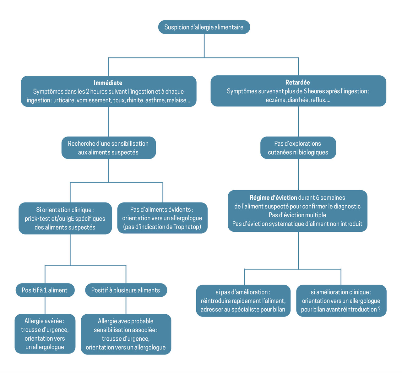 Il n’est ni pertinent ni recommandé de réaliser chez l’enfant ni l’adulte le dosage d’IgE spécifiques de mélanges d’aliments non ciblés par l’interrogatoire, comme le Trophatop. En effet, les tests ou méthodes utilisés autres que les IgE spécifiques n’ont pas fait la preuve de leur efficacité et peuvent conduire à un diagnostic et à un traitement inapproprié telle qu’une éviction alimentaire non justifiée, pouvant être elle-même responsable du développement d’allergie médiée par les IgE.8-10