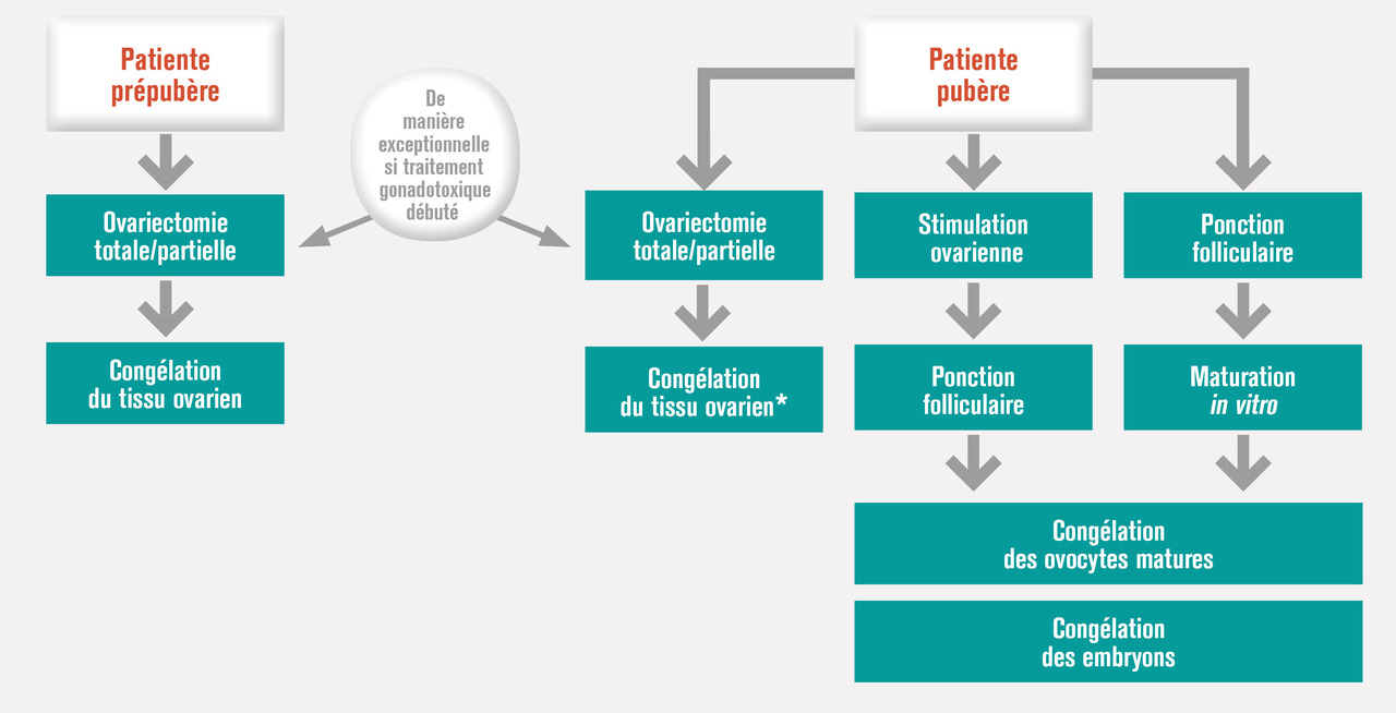 Chez le garçon prépubère ne produisant pas de spermatozoïdes ou le garçon pubère ayant déjà initié son traitement gonadotoxique (chimiothérapie ou radiothérapie) à dose faiblement toxique et n’ayant pas eu la possibilité de conserver ses spermatozoïdes préalablement, l’Onco- TESE n’a pas sa place. Dans la seconde situation, les spermatozoïdes qui sont produits ont subi l’effet mutagène des traitements et ne sont pas utilisables en AMP. La biopsie testiculaire associée à la congélation de fragments de tissu testiculaire semble être une solution acceptable, avec pour objectif une préservation des cellules souches spermatogoniales.12 Il est bien entendu important d’informer les patients et leurs parents, s’ils sont mineurs, que la possible utilisation ultérieure du tissu testiculaire congelé reste à l’heure actuelle du domaine de la recherche. En effet, les différentes modalités d’utilisation envisageables sont actuellement développées sur les modèles animaux, à savoir la maturation in vitro des cellules germinales souches isolées ou maintenues au sein du tissu testiculaire afin de produire in vitro des spermatozoïdes, la transplantation des cellules germinales souches ou la greffe du tissu testiculaire afin de produire in vivo des spermatozoïdes chez le patient guéri.9 Les spermatozoïdes produits in vitro ou in vivo seraient utilisables dans le cadre d’une ICSI. La majorité des conservations de tissu testiculaire chez le garçon prépubaire s’effectuent dans le champ du cancer avant la réalisation d’une allogreffe de cellules souches hématopoïétiques dans le cadre des leucémies aiguës ou d’une autogreffe de cellules souches hématopoïétiques dans le cadre des lymphomes ou des tumeurs du système nerveux central.9Techniques de préservation de la fertilité féminine