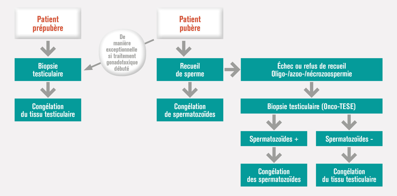 Il est théoriquement possible d’effectuer une congélation de spermatozoïdes obtenus après un recueil de sperme par masturbation, dès le stade III de Tanner avec un volume testiculaire supérieur à 5 mL. Néanmoins, en cas d’échec ou de refus de recueil de spermatozoïdes, d’oligozoospermie sévère, d’azoospermie ou de nécrozoospermie,13, 14 une procédure alternative consiste à envisager la biopsie testiculaire avec extraction de spermatozoïdes (Onco-TESE) suivie de leur congélation. Cette Onco-TESE, si elle s’avère négative, peut être associée à la congélation d’une partie du tissu testiculaire, afin de conserver des cellules souches spermatogoniales si elles sont présentes. La congélation de spermatozoïdes doit être effectuée avant la mise en route du traitement gonadotoxique pour éviter dans le cas de la chimiothérapie ou radiothérapie l’effet mutagène sur les spermatozoïdes avec un risque potentiel s’ils sont utilisés dans le cadre d’une AMP sur le conceptus (fausses couches, malformations, anomalies génétiques ou chromosomiques).12 Les spermatozoïdes éjaculés seront utilisables selon les différentes techniques d’AMP (insémination, FIV ou FIV avec micro- injection de spermatozoïde dans l’ovocyte [ICSI]) en fonction du nombre et de la mobilité des spermatozoïdes après décongélation. Les spermatozoïdes issus de la procédure Onco-TESE sont uniquement utilisables en ICSI.La majorité des conservations de spermatozoïdes s’effectuent dans le champ du cancer, principalement avant traitement du cancer du testicule, du lymphome malin hodgkinien ou non hodgkinien et des tumeurs solides.