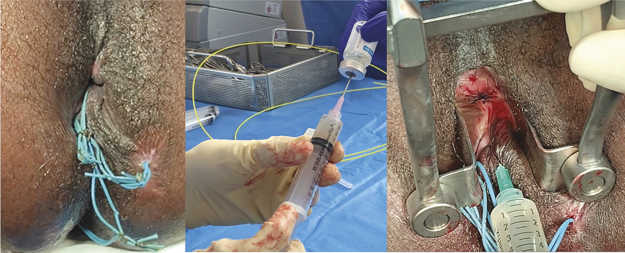 La décision de l’injection se prend en général en réunion de concertation multidisciplinaire impliquant au moins un gastroentérologue assurant l’optimisation du traitement médical, un proctologue chirurgical et un radiologue s’assurant de l’absence de collection résiduelle à l’IRM. La commande du produit doit se faire au moins seize jours avant la programmation du patient au bloc opératoire. Les CSM sont réceptionnées le jour même de l’injection et ont une durée de vie limitée à partir de leur déstockage et décongélation (20 heures à leur réception). Ceci complexifie la procédure de programmation, avec un risque de perte du produit et un impact financier en cas d’annulation du patient à la dernière minute. Certains programment donc un patient en « back up » le jour même pour éviter ce type de problèmes. Avant l’injection elle-même, une phase d’exploration sous anesthésie est conseillée afin de s’assurer de l’absence de diverticule résiduel non drainé et de préparer le trajet par un brossage et un lavage. La phase d’injection est programmée sous anesthésie, en moyenne quinze jours à un mois après cette exploration. Après ablation du ou des sétons, une injection sous-muqueuse de la moitié du produit est réalisée au niveau de l’orifice interne de la fistule après sa fermeture par un ou plusieurs points en X. En alternative, la technique de fermeture peut être un lambeau muqueux ou musculo-muqueux selon la taille de l’orifice interne et les habitudes du proctologue (Avec quels résultats ?