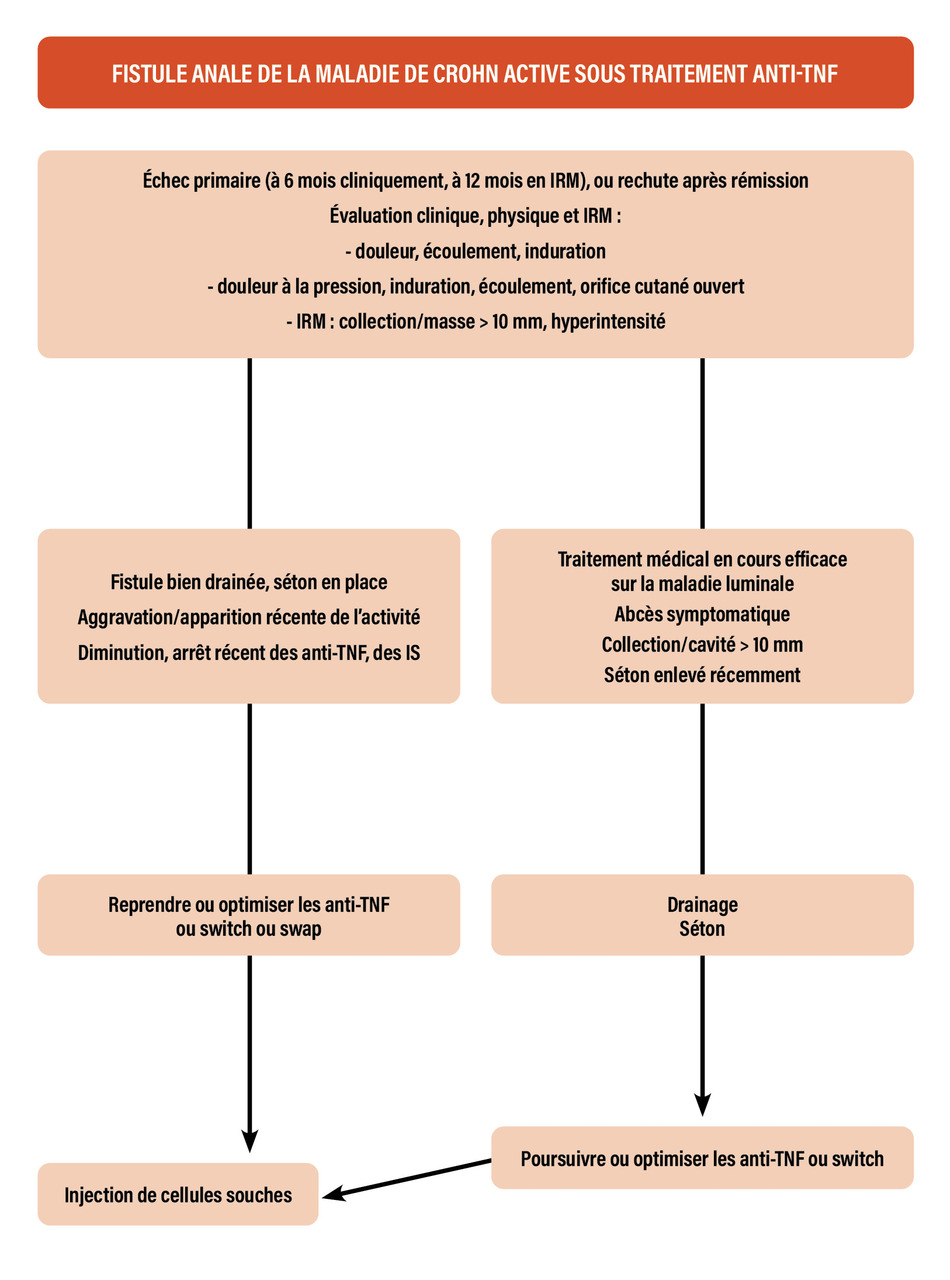 Le traitement d’une atteinte fistuleuse anopérinéale de la maladie de Crohn est complexe et multidisciplinaire, avec une prise en charge médico-chirurgicale impliquant au minimum un gastroentérologue, un proctologue chirurgical et un radiologue.