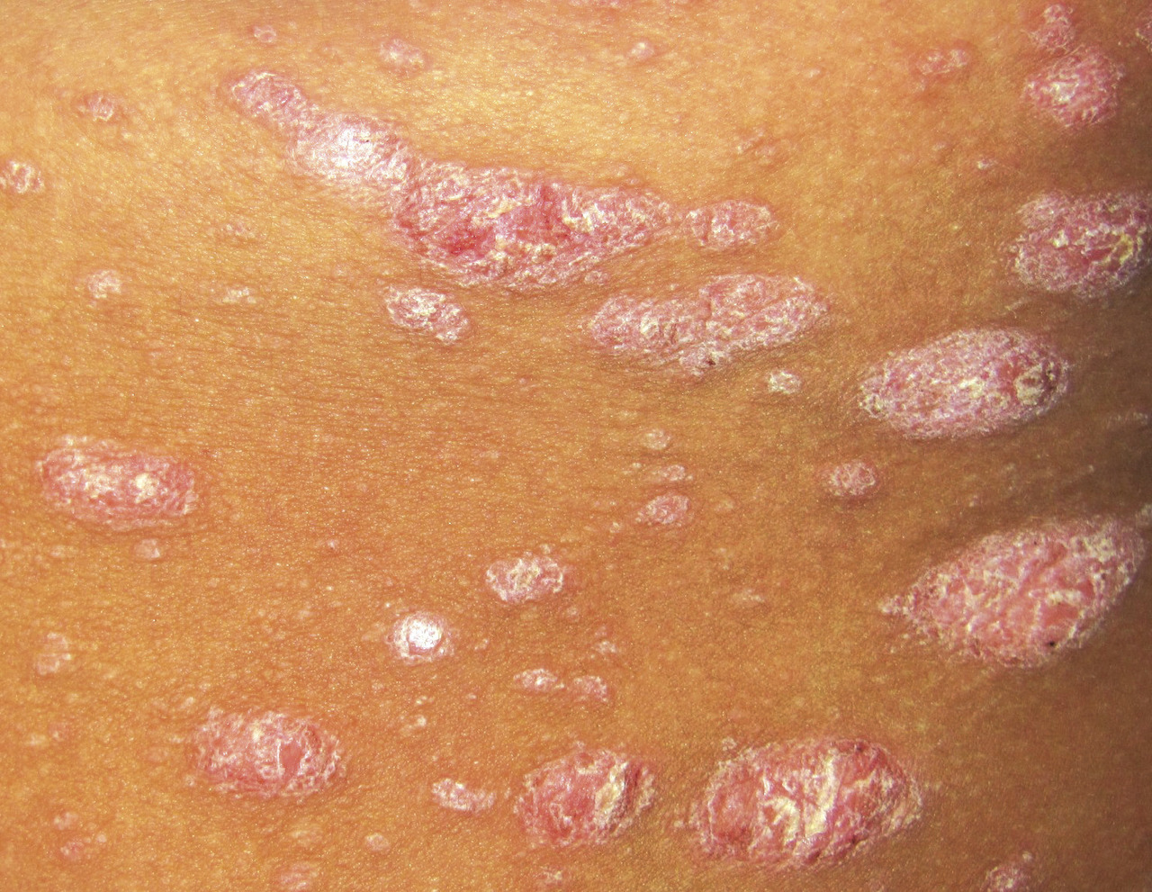 C’est une plaque érythématosquameuse, bien limitée, plus ou moins infiltrée, ovalaire ou à contours polycycliques, rose pâle à rouge violacé, recouverte de squames superficielles qui peuvent être fines à très épaisses (fig. 1).