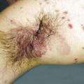 - le pendant chez l’adulte est le « psoriasis inversé » (fig. 8), avec des atteintes des plis (axillaires, inguinaux, sous-mammaires, interfessiers, rétro-auriculaires) et de la région génitale, avec des lésions peu ou non squameuses, bien limitées, rouge brillant, souvent fissuraires au fond des plis ;