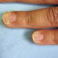 - le « psoriasis unguéal » (fig. 6) prend un aspect de dépression punctiforme (en « dé à coudre »), d’onychodystrophie, d’onycholyse (décollement de la tablette unguéale, jaunâtre), avec aspect de taches saumonées unguéales. Il peut toucher un, plusieurs, voire tous les ongles des mains et des pieds ;