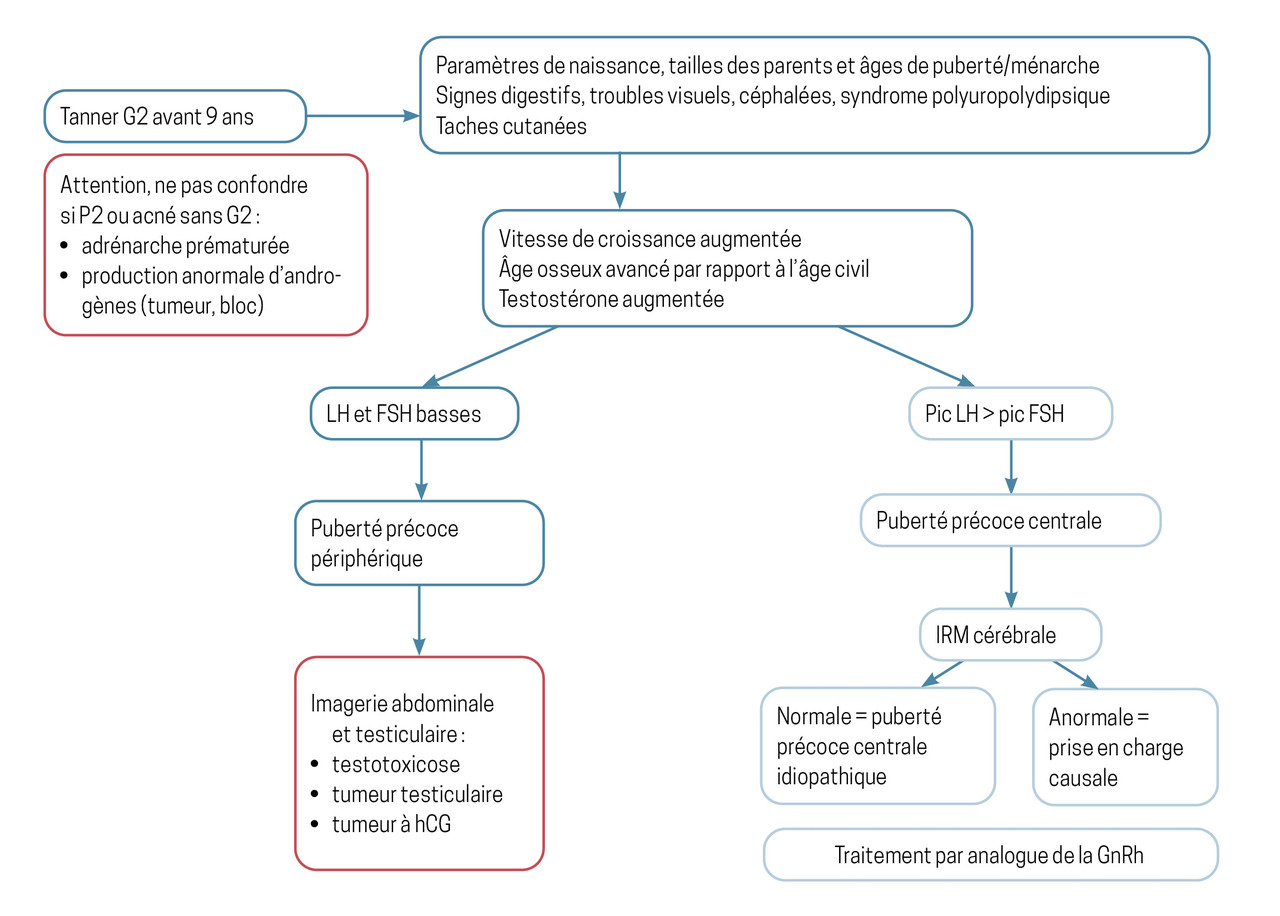 Un saignement vaginal, une accélération de la vitesse de croissance, une hypertrophie clitoridienne et une avance sur l’âge osseux sont des signes inquiétants qui doivent faire adresser à un spécialiste sans délai.
