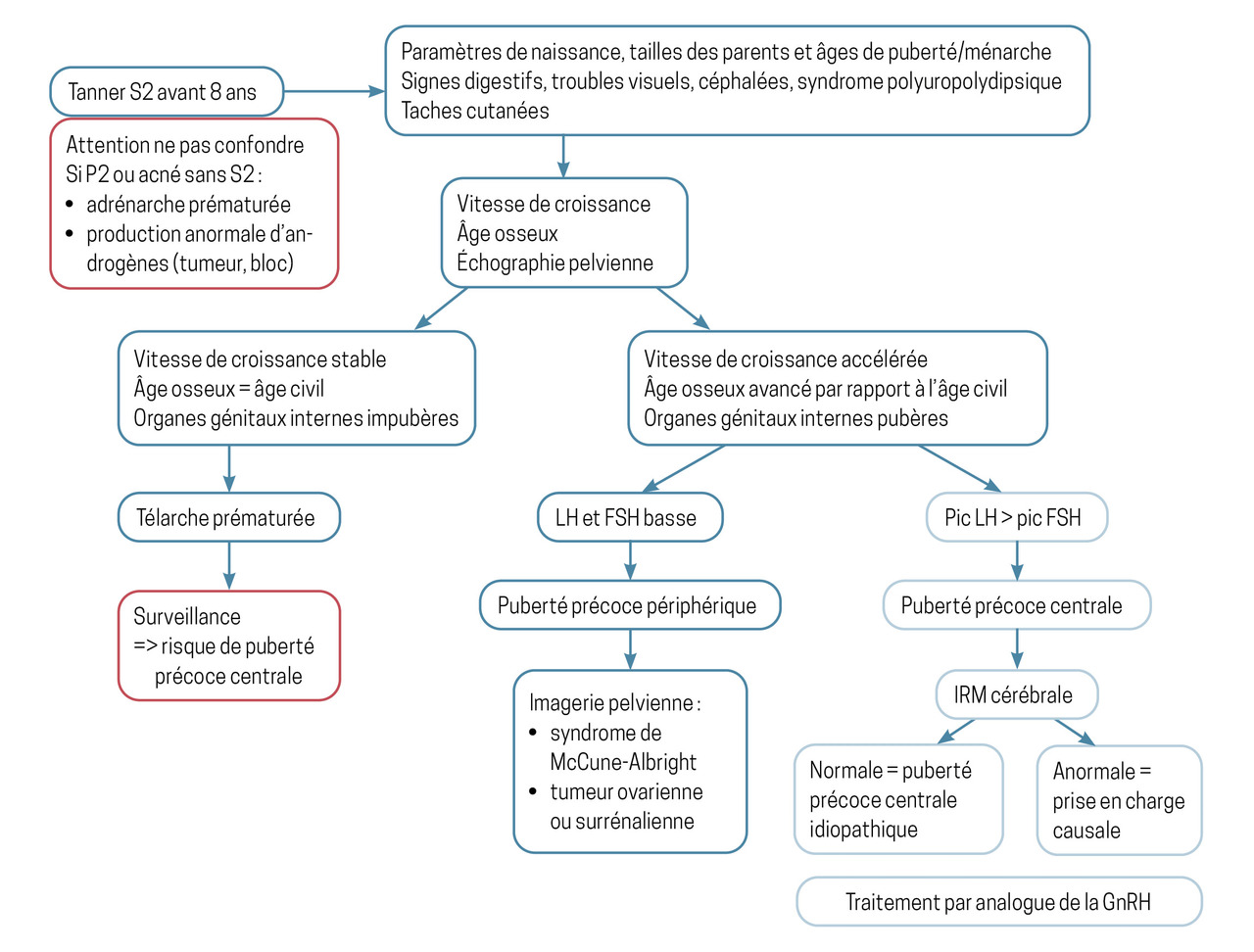 – chez la fille, par un développement mammaire survenant avant l’âge de 8 ans (l’apparition de la ménarche avant 9 ans peut être un critère additionnel) ;