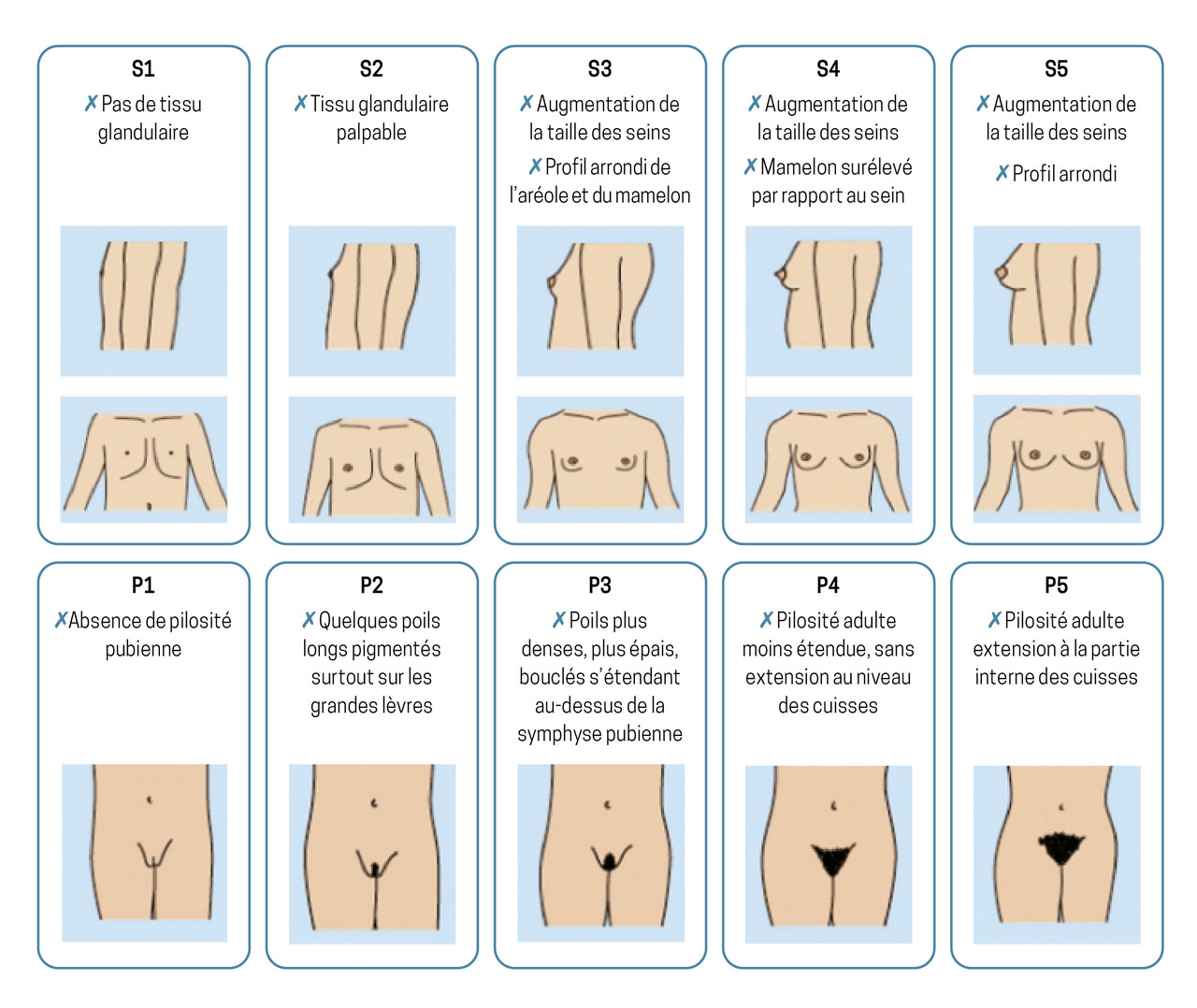 La classification de Tanner permet de définir les différents stades du développement pubertaire : développement mammaire (S), développement testiculaire (G) et pilosité pubienne (P).