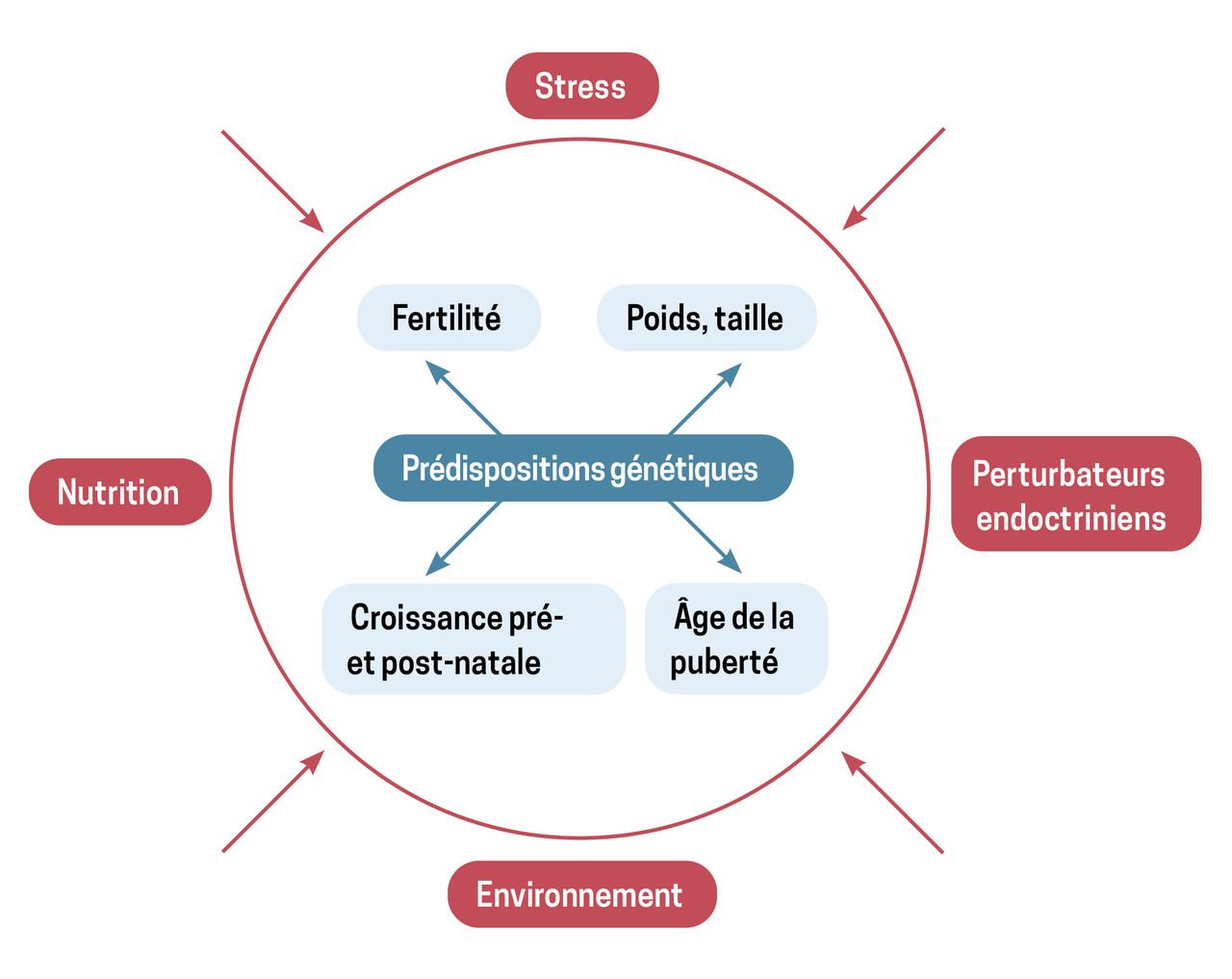 – les facteurs génétiques : les études réalisées avec des jumeaux indiquent que 70 à 80 % des variations de l’âge pubertaire sont expliquées par des facteurs génétiques ;
