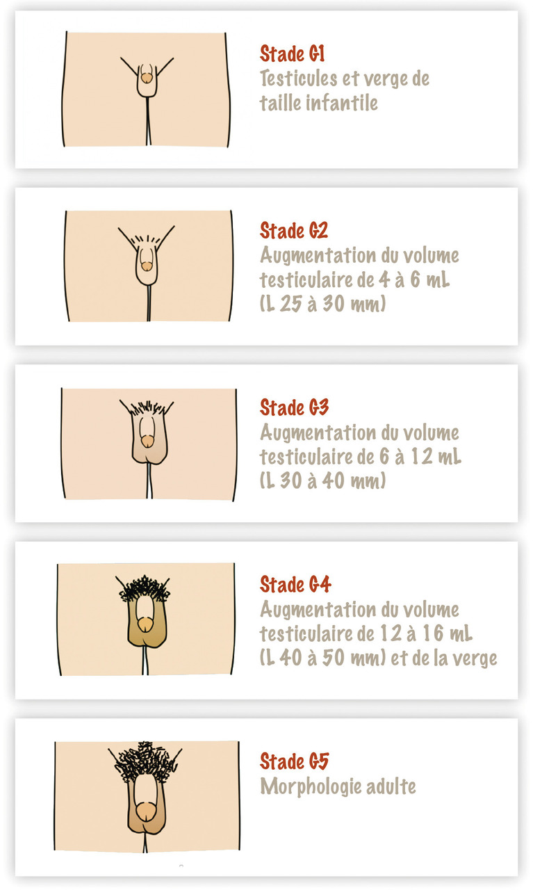 Chez le garçon : absence d’augmentation du volume testiculaire (< 4 mL) à 14 ans.