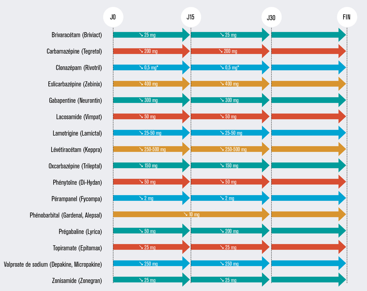 Afin d’anticiper une possible récidive, il est parfois utile d’établir la posologie de reprise du traitement, qu’il s’agisse de revenir au palier précédent (en cas de crise focale, par exemple) ou à la dose initiale (en cas de crise tonico-clonique généralisée).