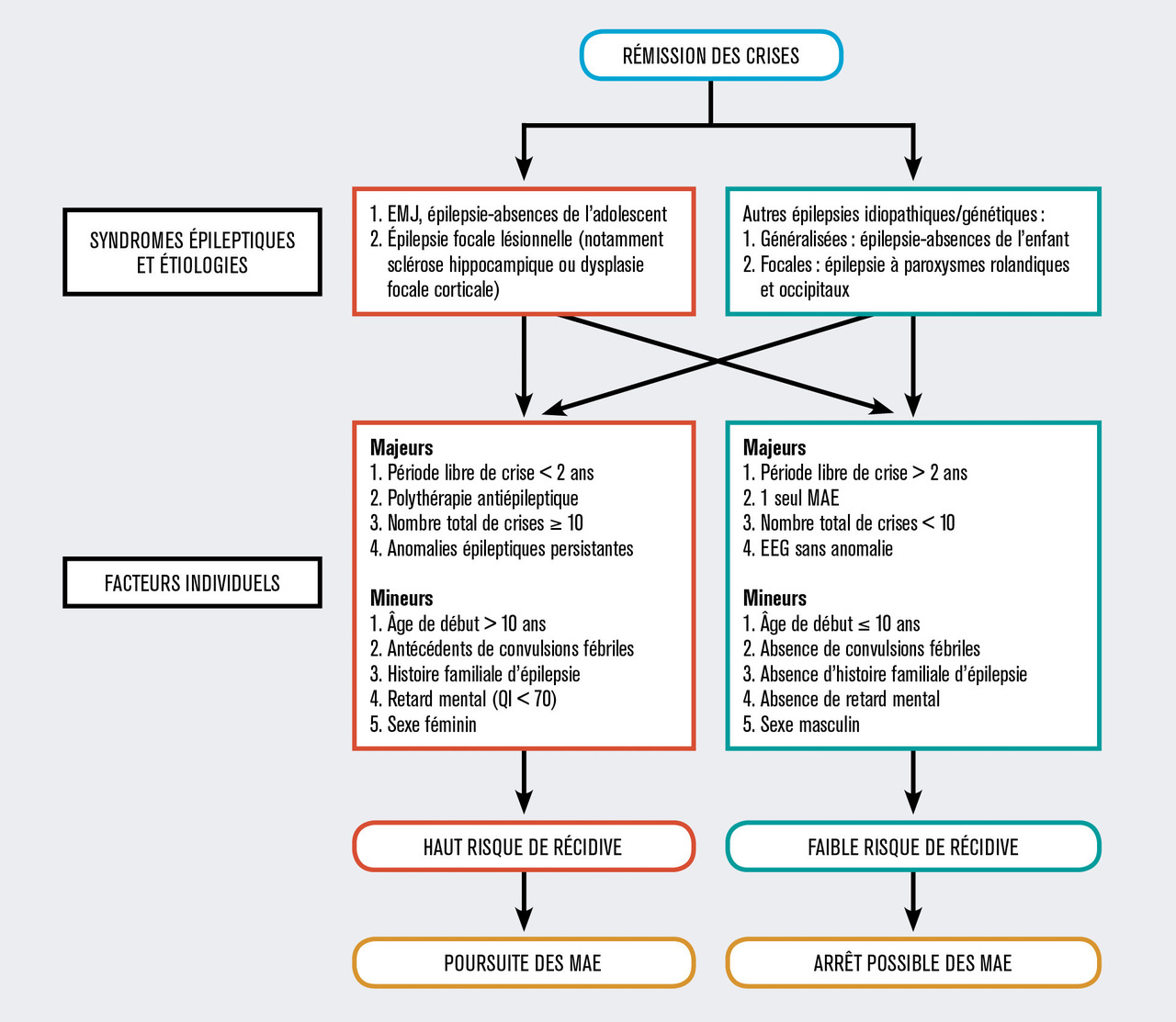 Pour un même syndrome épileptique, la sévérité de l’épilepsie varie d’un patient à l’autre. L’appréciation du risque individuel de récidive est donc nécessaire. Plusieurs facteurs prédictifs de récidive de crises après sevrage ont été rapportés dans la littérature :1, 5-12