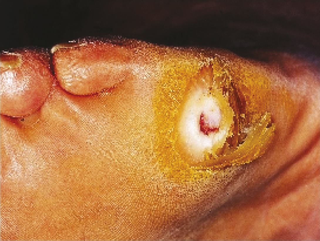 La cause la plus fréquente est l’hyperkératose : c’est la corne dure qui a creusé la plaie (fig. 1 ). Il faut faire une ordonnance pour que l’infirmier(ère) retire cette corne avec une curette ou un scalpel (fig. 2 ).