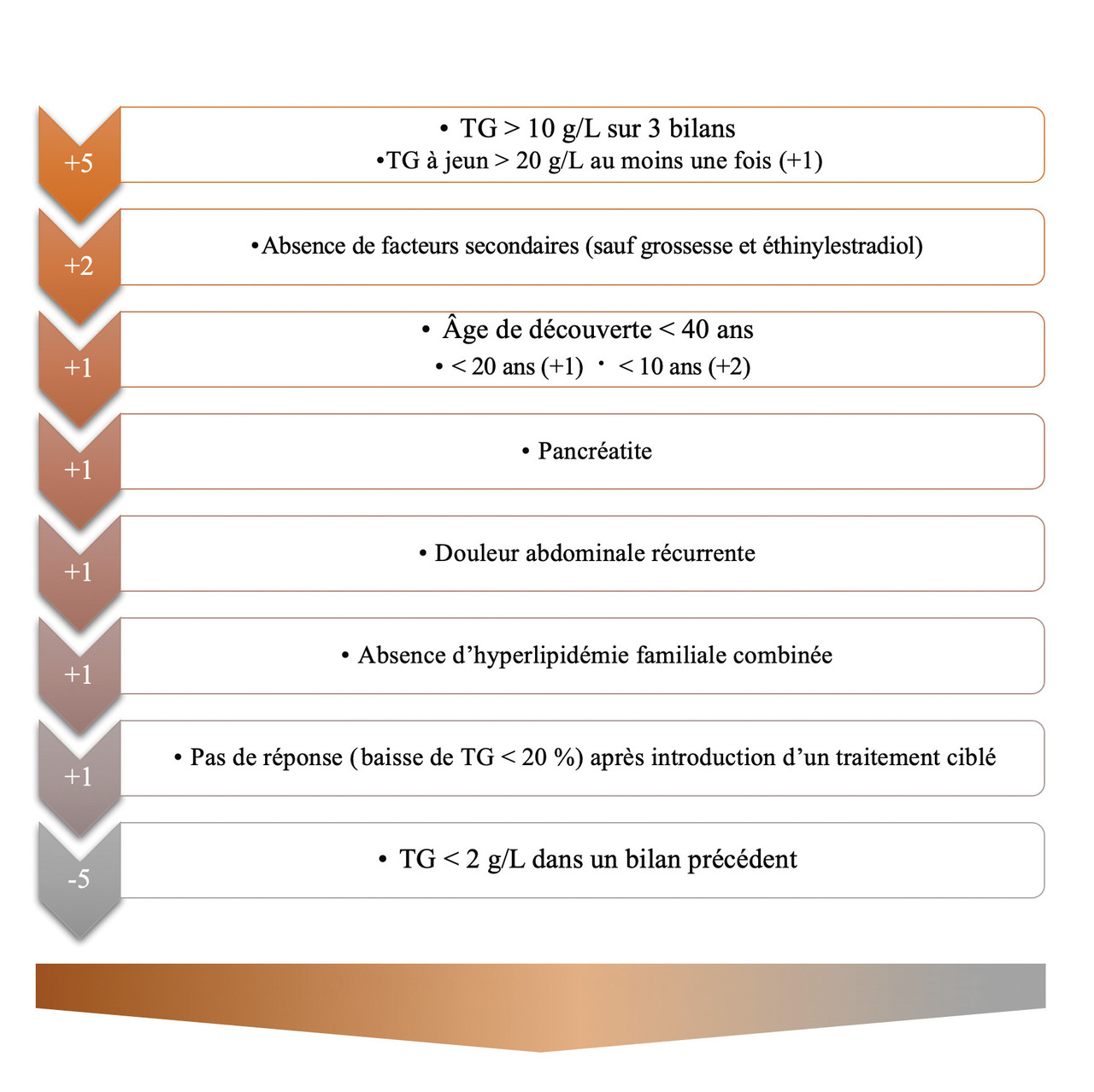 Les hypertriglycéridémies sont très fréquemment transitoires. Un bilan lipidique retrouvant des valeurs de TG > 10 g/L chez un patient qui ne présente pas de signes cliniques suspects pour une pancréatite aiguë doit être répété dans les 48 heures qui suivent la prise de sang. S’il y a eu une consommation excessive d’alcool ou de produits sucrés, s’il y a un diabète non contrôlé, il faudra introduire rapidement des règles hygiénodiététiques ciblées (régime BYC, boisson-yaourt-compote) et répéter un dosage des TG après 48 heures. Si les valeurs de TG restent élevées à plus de 5 g/L, une introduction de traitement par fibrate peut être envisagée. S’il y a une baisse en dessous de 2 g/L, il n’y a pas d’indication à l’introduction d’un traitement hypolipémiant, mais le maintien de règles hygiénodiététiques plus strictes doit être proposé au patient.