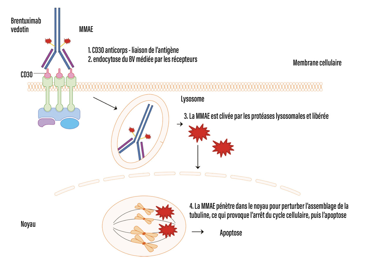 Le brentuximab vedotin (BV), anticorps anti-CD30 couplé à la monométhylauristatine (poison du fuseau), capable de se fixer à la surface des cellules tumorales qui expriment par définition le CD30 (Les anticorps anti-PD1 restaurent la défense antitumorale