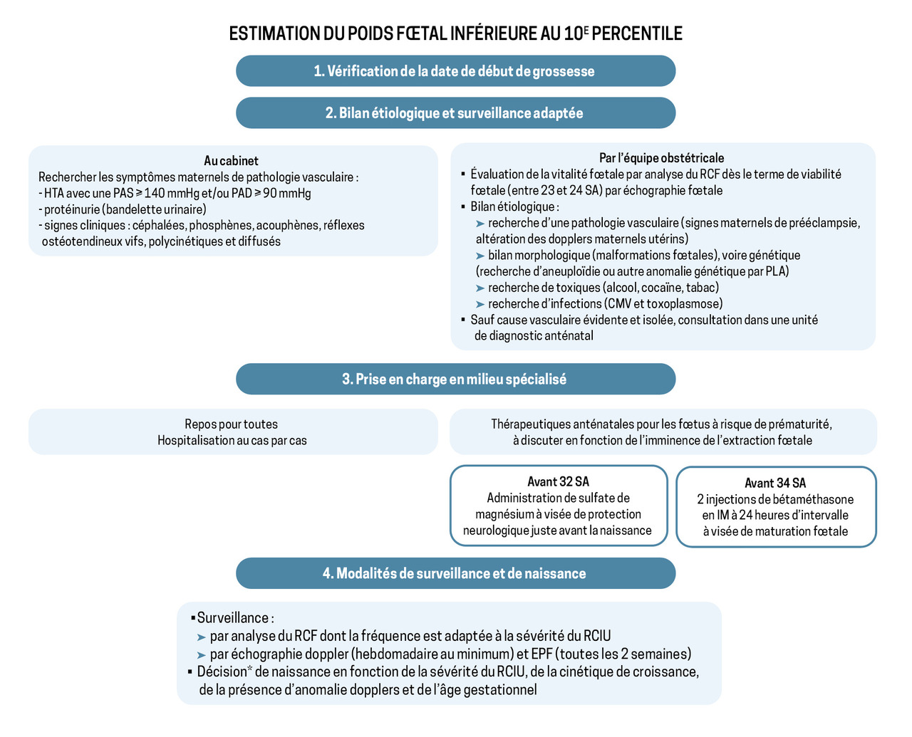 Par définition, le retard de croissance intra-utérin (RCIU) et le petit poids pour l’âge gestationnel (PAG) sont des situations obstétricales fréquentes puisque, au sein de la population générale, 10 % des fœtus ont une estimation de poids fœtal inférieur au 10e percentile. Le défi consiste à identifier, à la suite de ce dépistage, les fœtus affectés par un retard de croissance pathologique, donc à risque augmenté de morbi-mortalité, afin de proposer une prise en charge adéquate (fig. 1).