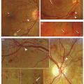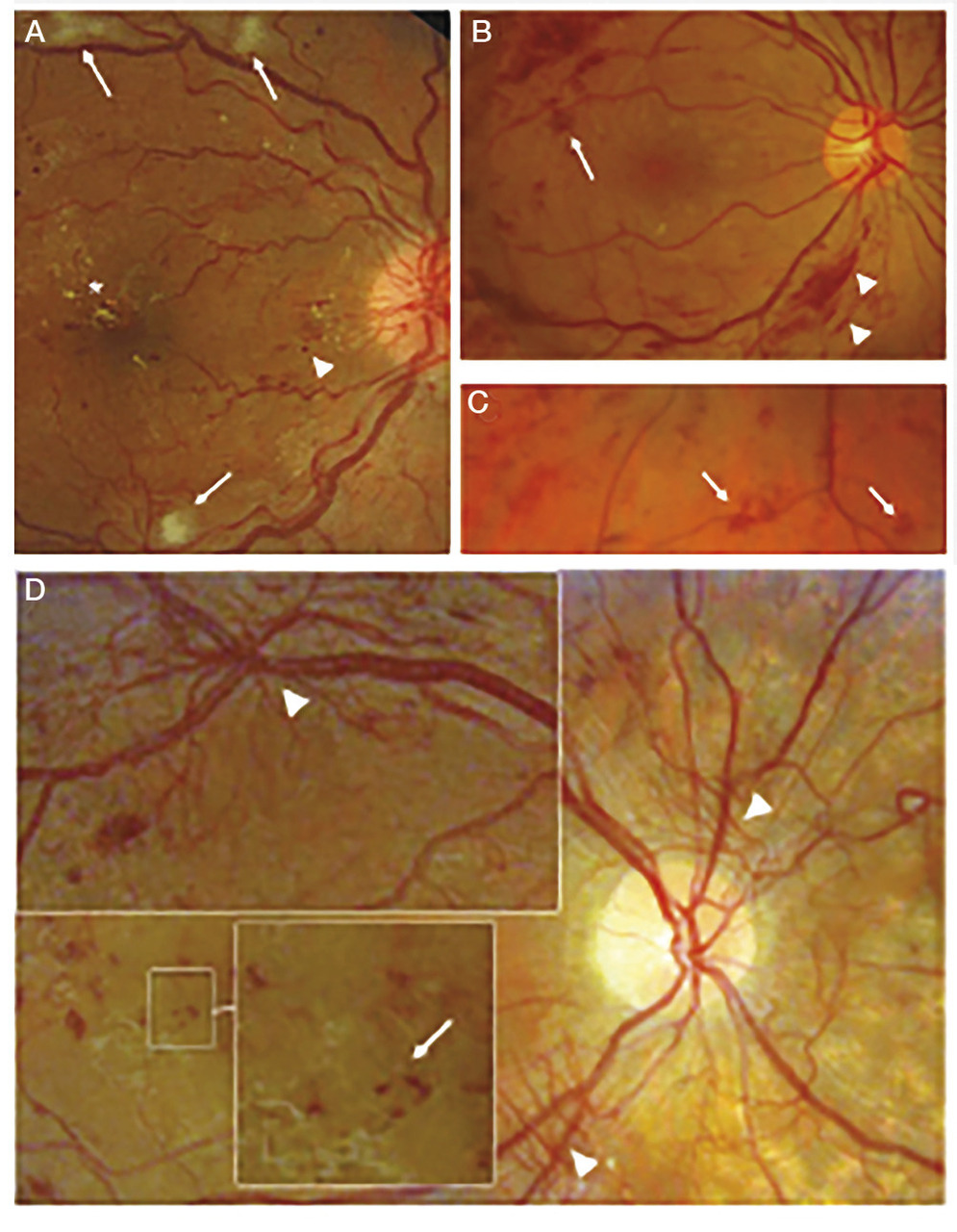 – nodules cotonneux : épaississements blanchâtres superficiels, traduisant un infarcissement local dans la couche des fibres optiques ; retrouvés en cas de forme rapidement progressive et/ou si rétinopathie hypertensive associée ; disparaissent en quelques semaines ou mois ;