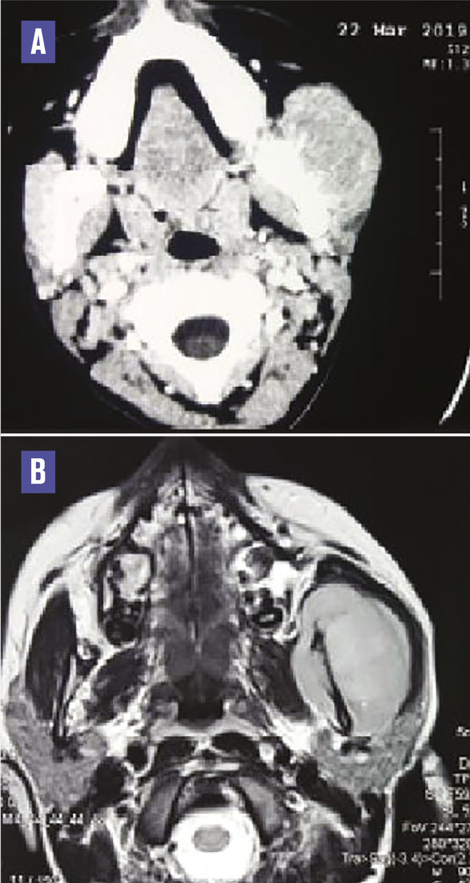 Le sarcome d’Ewing est une tumeur neuro-ectodermique. C’est une tumeur des os longs, et les localisations céphaliques et faciales sont rares (2 à 4 %). Son incidence est estimée à 3/100 000 enfants par an.1 Il est métastatique dans 20 à 30 % des cas dès le diagnostic, ce qui aggrave considérablement le pronostic et influence la conduite thérapeutique, d’où l’importance d’établir un diagnostic précoce ;2 or, en cas de localisation mandibulaire, le diagnostic de sarcome d’Ewing est souvent fait avec retard. Tout jeune patient ayant une lésion osseuse suspecte doit être impérativement adressé en milieu spécialisé afin de bénéficier dans les plus brefs délais d’une imagerie locorégionale complétée d’une biopsie afin d’orienter le diagnostic.