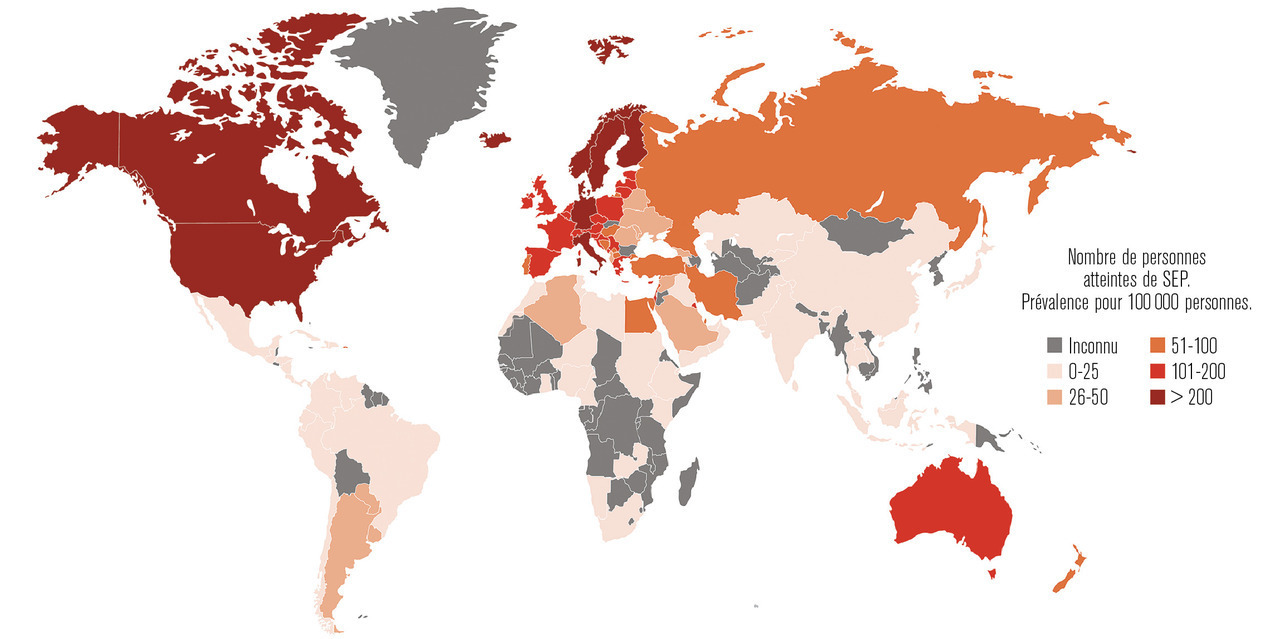 La sclérose en plaques (SEP) est la maladie inflammatoire démyélinisante la plus répandue dans les pays industrialisés. On estime actuellement que 2,8 millions de personnes sont touchées, soit une prévalence globale de 35,9 pour 100 000, avec un âge moyen au diagnostic de 32 ans. Il existe d’importantes variations de prévalence à travers le monde : on admet habituellement un gradient nord-sud avec, par exemple, une prévalence élevée en Amérique du Nord et en Europe (> à 100 pour 100 000 habitants) et faible en Asie de l’Est et en Afrique subsaharienne (environ 2 pour 100 000 habitants), voir figure.