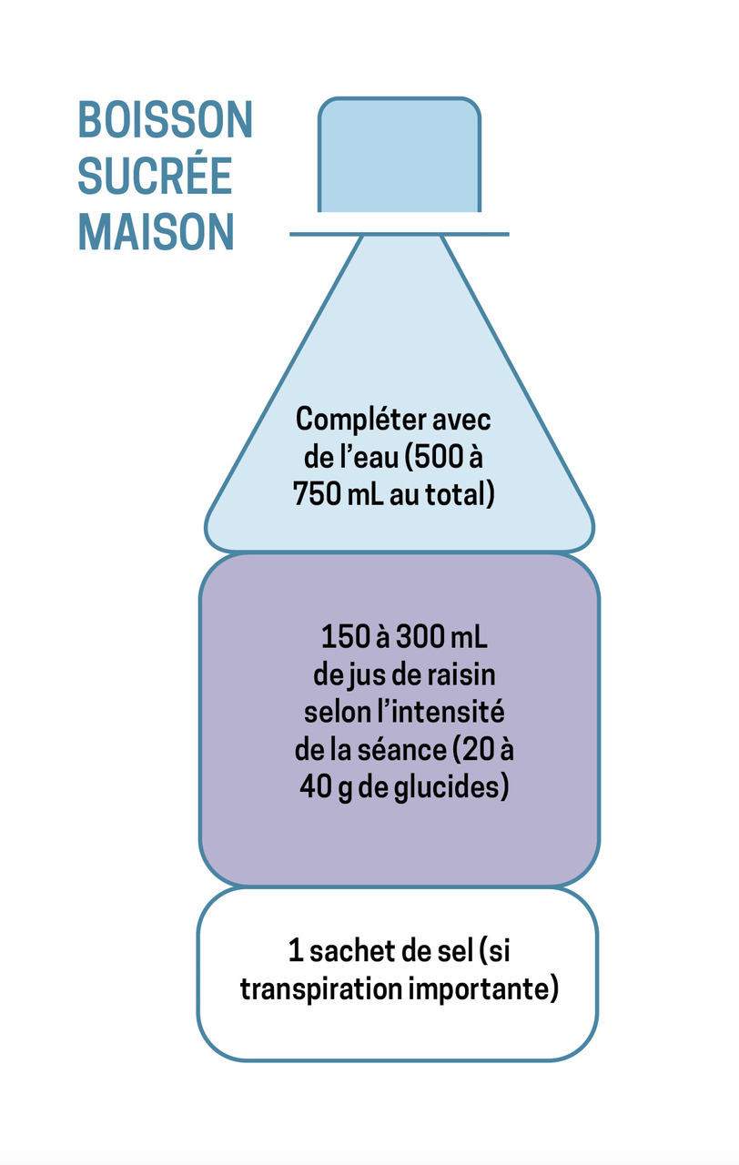 - en cas de difficulté à consommer des aliments solides, boisson énergétique dont l’apport glucidique doit se situer entre 20 et 40 g/L.
