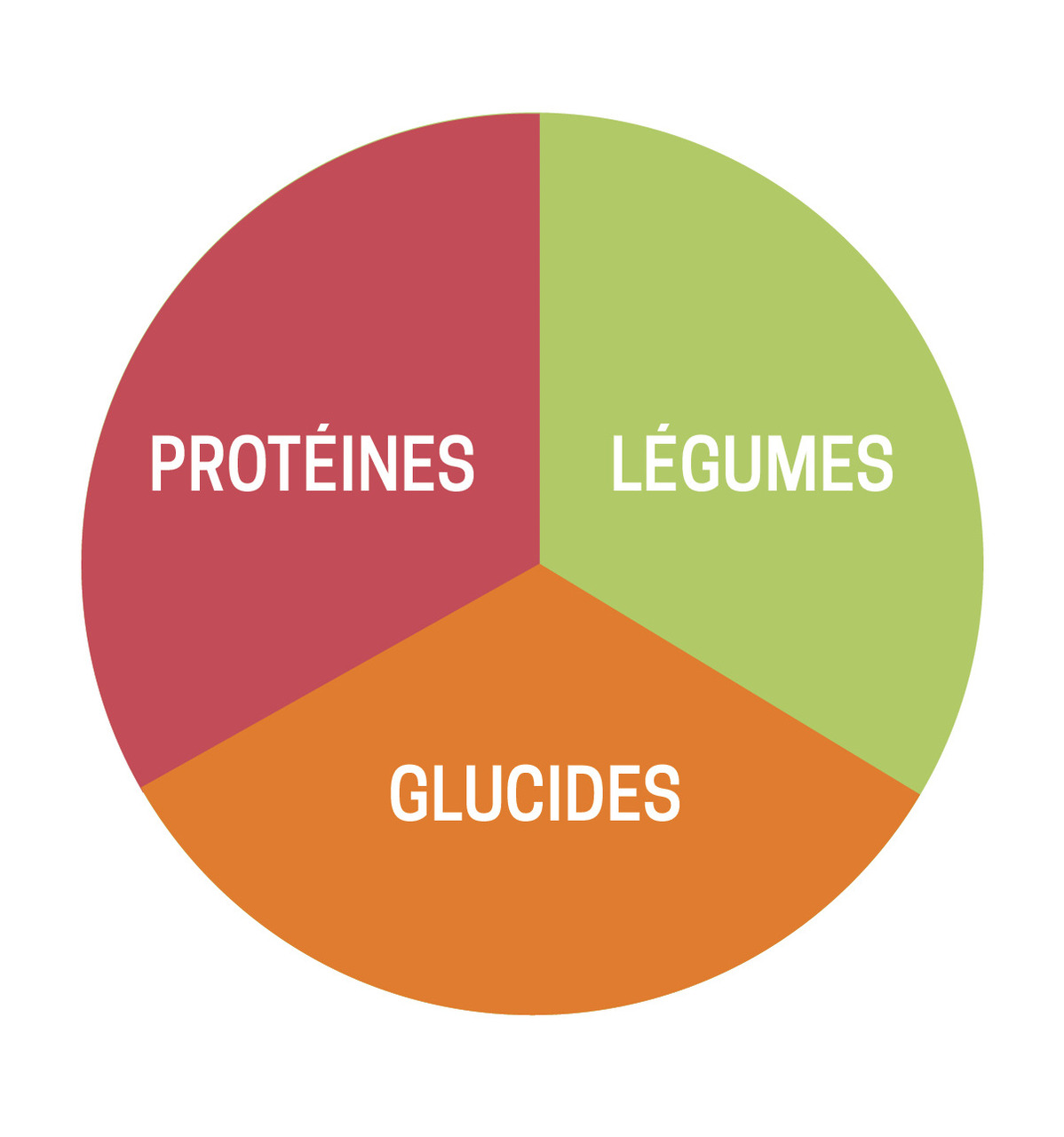 - un plat principal composé de protéines (un tiers), de féculents (un tiers) et de légumes (un tiers) [fig. 2] ;