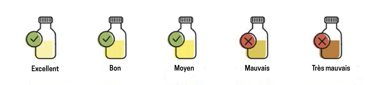 La couleur des urines reflète l’état d’hydratation de l’athlète (fig. 3). Une bonne hydratation se caractérise notamment par des urines claires et limpides.