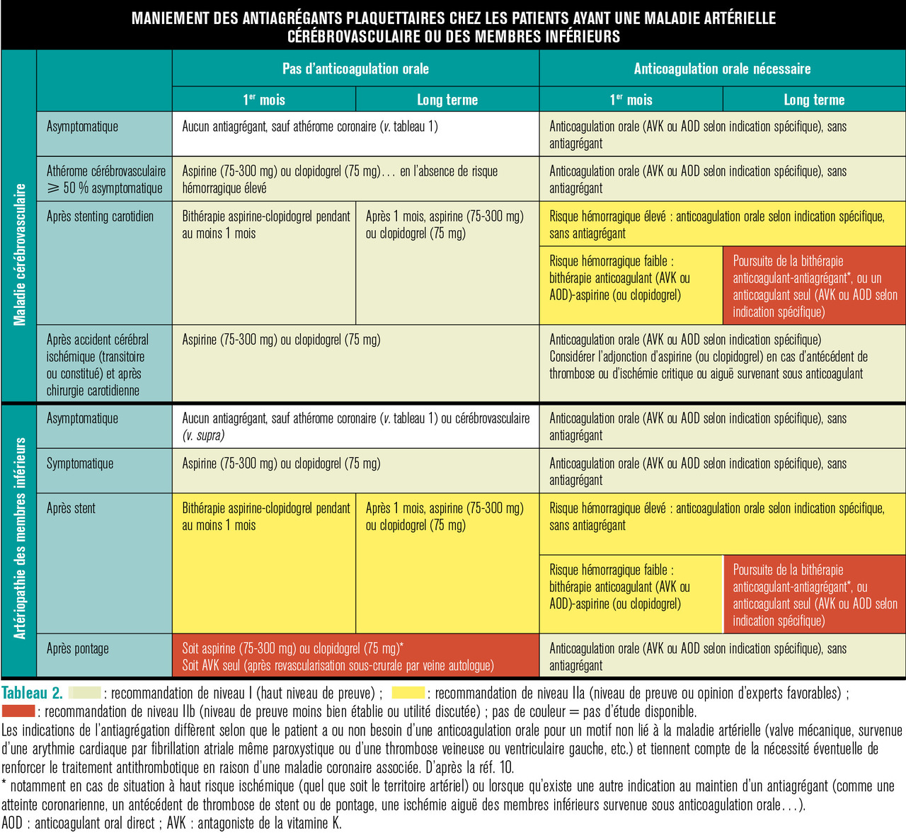 Dans ce cas, la stratégie antithrombotique a été très remaniée,3 variant selon que le patient nécessite ou non un traitement anticoagulant oral pour une autre raison que la maladie artérielle (tableau 2) :