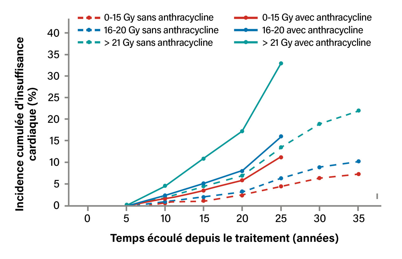 Les complications cardiovasculaires sont également des séquelles au premier plan en matière de morbidité et de mortalité. Les grandes études épidémiologiques confirment l’augmentation du risque de cardiopathie avec l’utilisation d’une chimiothérapie comportant des anthracyclines, avec une augmentation linéaire du risque en fonction des doses reçues.8,9 C’est également le cas pour la radiothérapie médiastinale avec les doses de rayonnement reçues sur le massif cardiaque, avec une augmentation du risque dès la dose de 20 Gy8 et un effet cumulatif lors de l’utilisation d’anthracyclines (fig. 2 ).