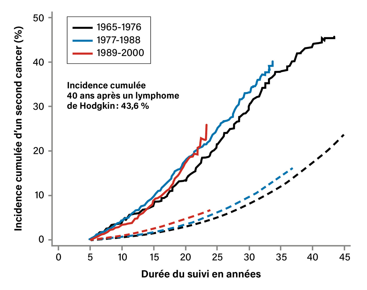 Dans trois études épidémiologiques ayant analysé des patients traités de 1963 à 2001,1-3 le risque relatif de second cancer est de 2,62 à 5 comparé à la population générale, avec une incidence cumulative de 43,6 % de cancer secondaire sur quarante ans de suivi dans l’une de ces études (fig. 1 ).1 Il ne semble pas que ce sur-risque ait diminué pour les périodes les plus récentes de ces études, de 1990 à 2000. Cependant, le risque de cancer secondaire est 60 % moins important lorsque les patients ne reçoivent pas de radiothérapie et de 40 % en cas de radiothérapie avec des champs d’irradiation moins importants qu’une irradiation « en mantelet ». Une étude du LH de stade localisé traité par chimiothérapie et radiothérapie de 1993 à 2003 retrouve une incidence cumulative de cancers secondaires à dix et vingt ans de 5 % et 27 % respectivement.4 Des analyses récentes sont cependant plus encourageantes par rapport à la réduction du risque de cancer secondaire. Une analyse de 1999 à 2005 des registres suédois de patients traités par chimiothérapie de type ABVD, deux à quatre cycles, suivie d’une radiothérapie « moderne » avec des champs d’irradiation limités retrouve un sur-risque limité (hazard ratio : 1,5) mais pas totalement identique à celui de la population générale.5 La limite de cette étude est bien entendu un recul encore peu important.