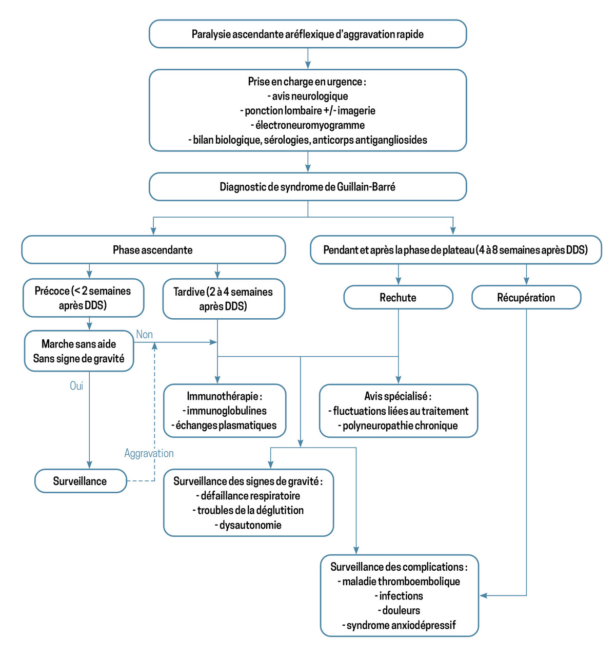 Le SGB est une urgence diagnostique et thérapeutique (figure). La suspicion clinique doit amener le médecin de ville à orienter le patient en urgence vers un centre hospitalier. Durant la phase ascendante, une surveillance étroite en hospitalisation est nécessaire. La présence de signes de gravité comme des troubles de la déglutition, une dyspnée ou une dysautonomie doit motiver l’avis d’un médecin réanimateur.